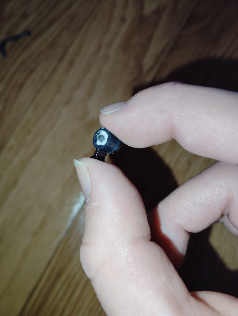 そして肝心のディテールアップ用のパーツですが、ジャンクパーツの中にあったSDザクの動力パイプを、ヤスリやサンドペーパーで直径1,3mmほどになるまで削って成型しました。