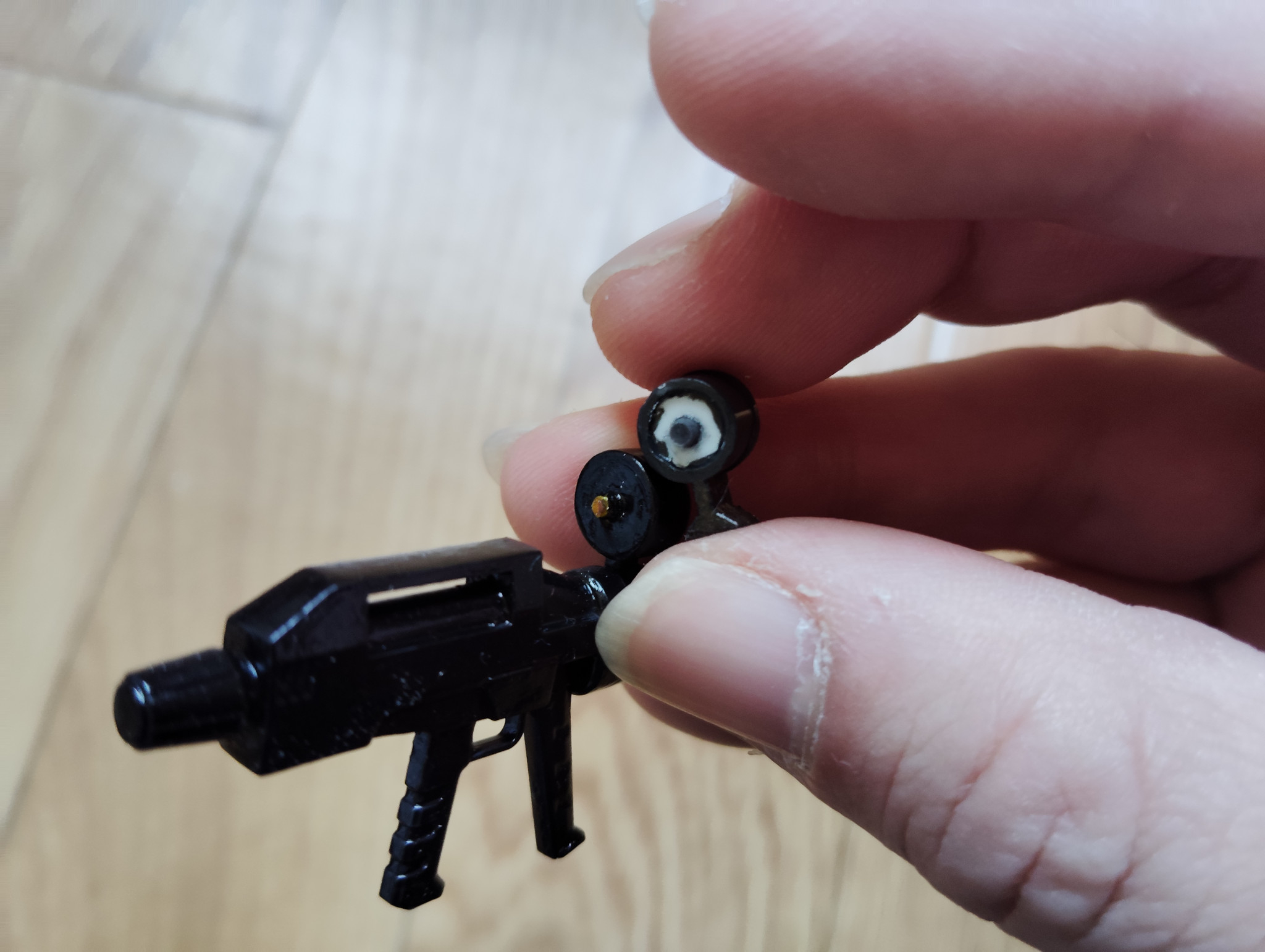 前回、「次回はいよいよ塗装して、この新型ビームライフルを完成させたいと思います」と書きましたが、ここに来てまだ改修が必要なポイントが残っていることに気付いてしまいました・・・。