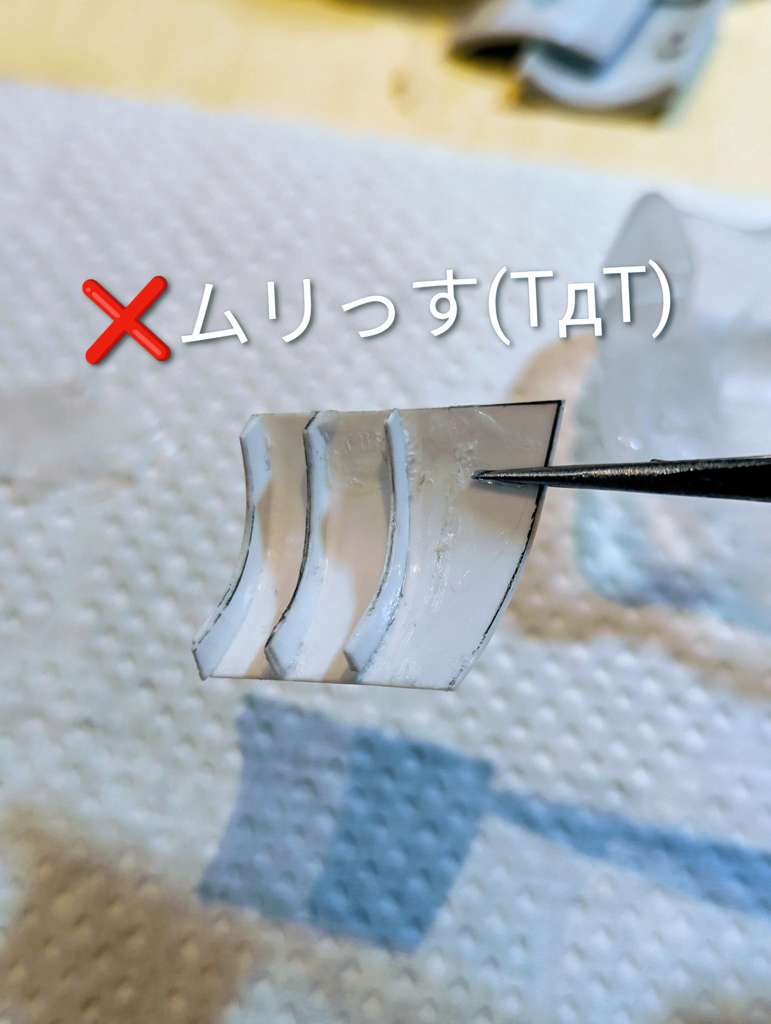 3.肩パーツを2にずぶずぶとつっこみます😸そして両端に型枠同士をはめる為にカットします(写真4)その後、20分待ちます