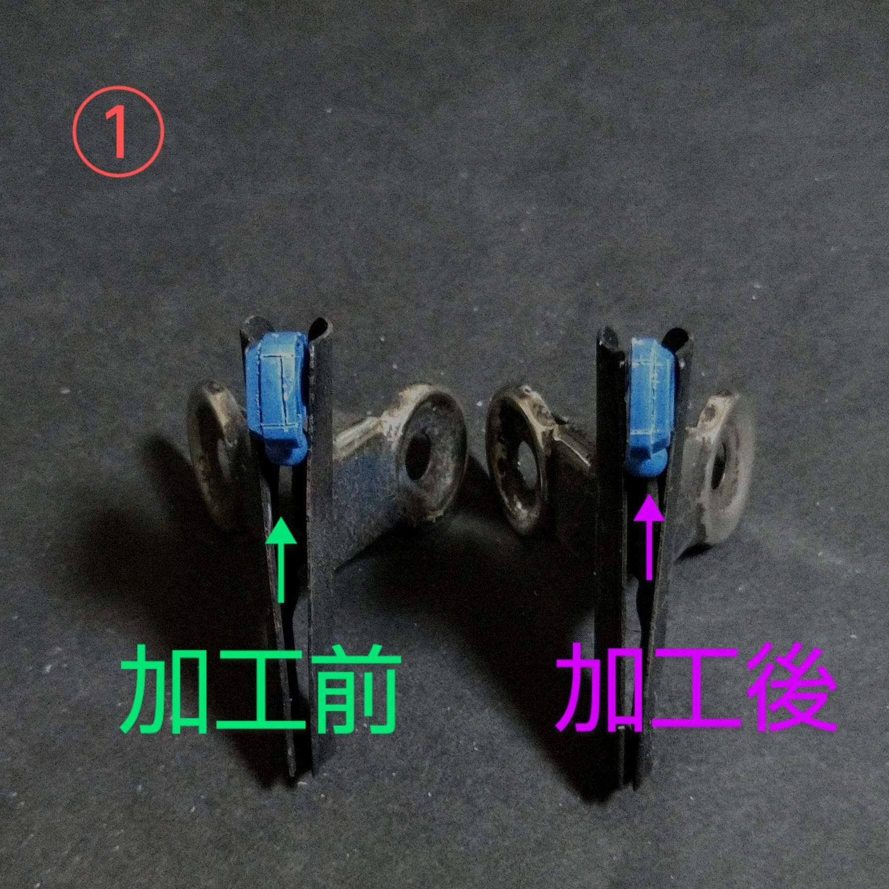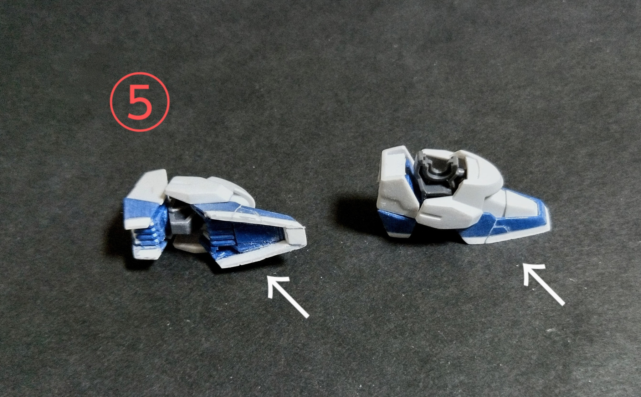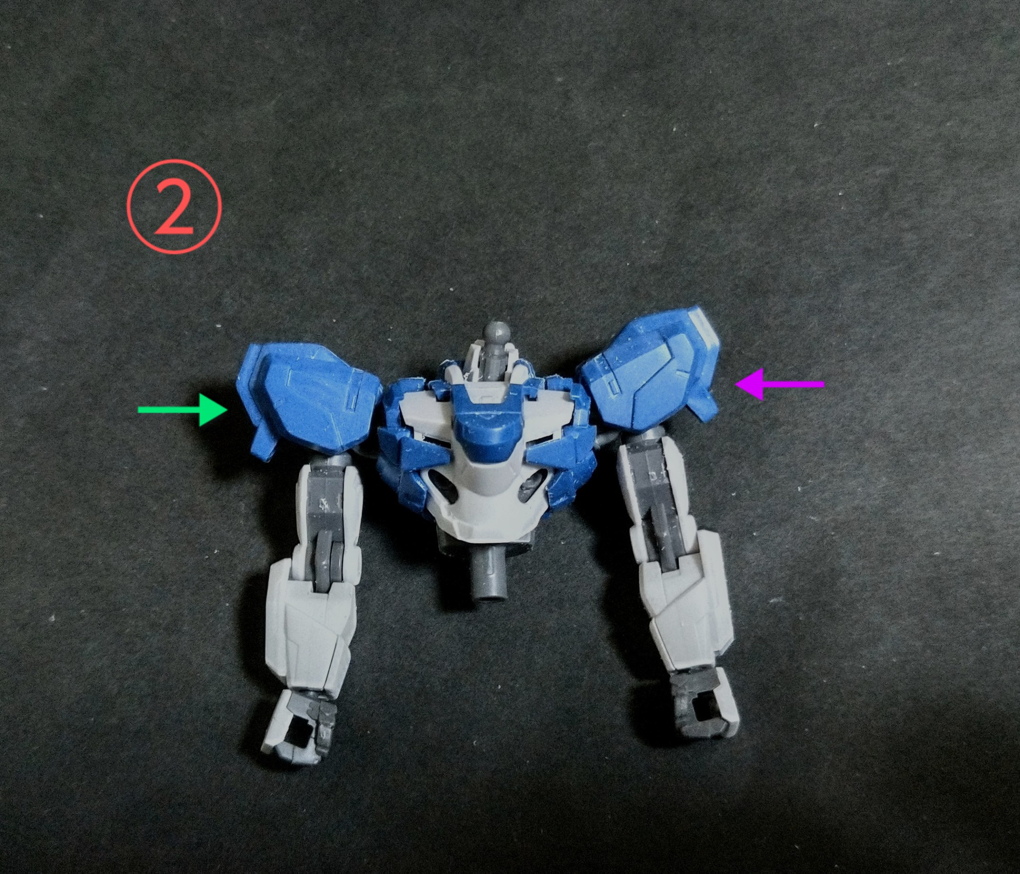 ①肩の付け根のパーツを少し削って角度を付くように加工。