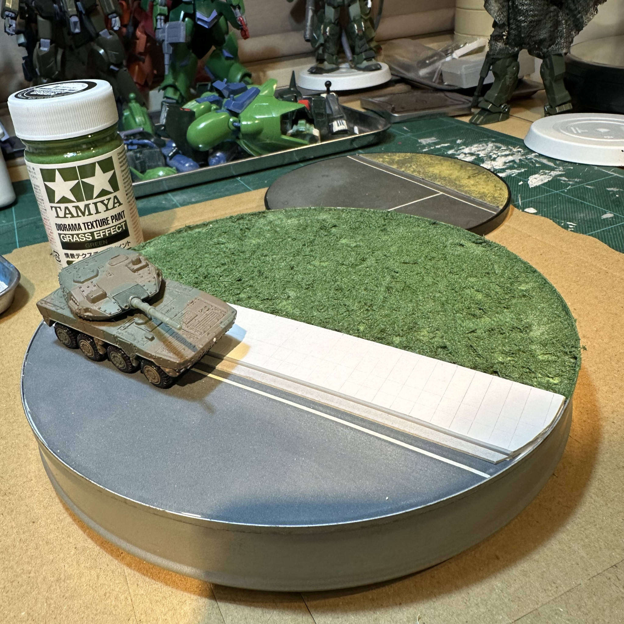 ぱんきち 2025.12/06更新 撮影用ヴィネットベース「【旧キット】MSVザクマインレイヤー」制作中 72 28 いいねしたモデラー(28) 2 作品を共有 撮影用に使っていた旧ヴィネットベース(写真奥)が、大分傷んできたので新調!適当な缶の蓋にスチレンボードをはめ込み、アスファルトは1000番の耐水ペーパーにラインテープで白線を引き、歩道は白色ボール紙にカッターでグリッドを引きPC板舗装を表現・L字溝は同じくポール紙の裏面と1mmプラ棒・地被植物はタミヤの「情景テクスチャペイント・草グリーン」で表現しました♪ちなみに車両はトミカの16式機動戦闘車(S=1/119) 制作中 ディスプレイベース ヴィネット コメント コメントをして応援しよう コメントにはログインが必要です RaMuShizu 5時間前 ペーパーアスファルト良いアイディアですね。目から鱗です! ぱんきち 2時間前 1/144ぐらいのアスファルトは耐水ペーパーあたりが丁度いいんじゃないかと思うんです。艶消しでいい感じです笑 ぱんきち 1/144を好物としております。 リョウサンキ・スキーです。 無断転載を禁止します。 All rights reserved. ぱんきちさんがお薦めする作品 試作型水陸両用モビルスーツ 1/144ガンタンクⅡ(Z版) 水中用ザク HGゾゴック×30MS MS少女 ゾゴックちゃん 15 【旧キット】ガザD 旧キットガザD、竣工です! 16 【HGUC】ガンキャノン量産型・ホワイトディンゴ仕様 過去作・ガンキャノン量産型をホワイトディンゴ仕様にてリニュー… 15 【HGUC】ハイザック+旧キットZ武器セット HGUCハイザック竣工しました! 17 【Mixing】ゲム・カモフver.Zeonic ゲム・カモフVer.Zeonic竣工です! ぱんきちさんのページ この作品をお薦め作品に設定する Please login to update your profile! Please login to update your profile! Please login to update your profile! Please login to update your profile!
