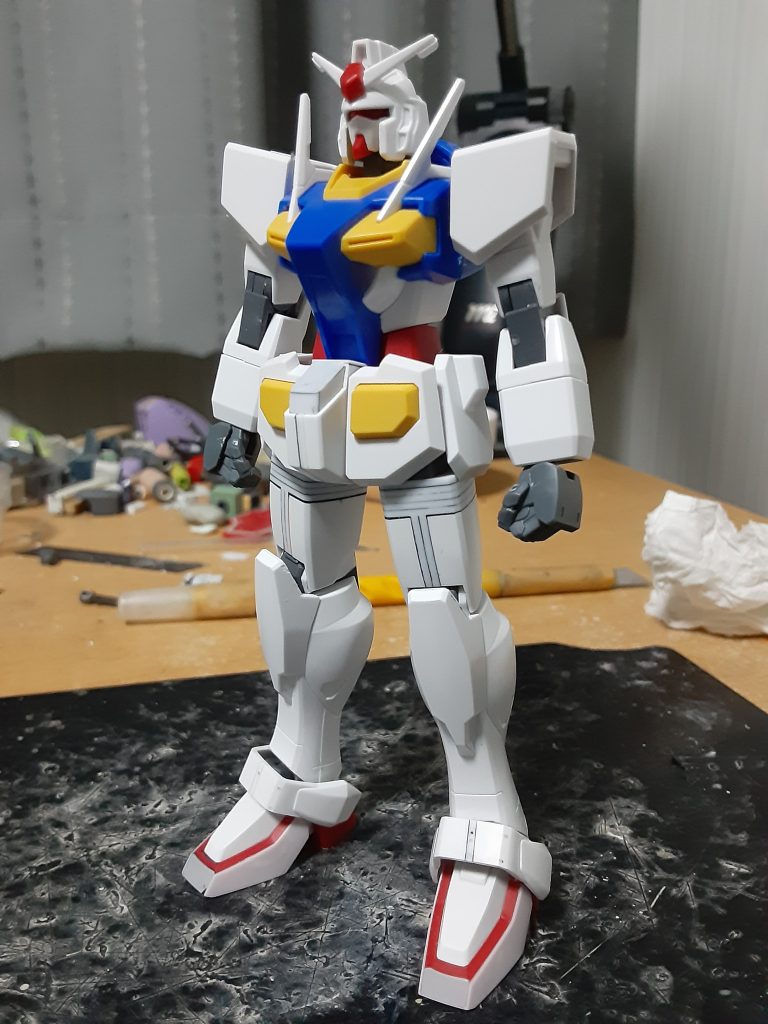 下半身の工作が終わった0ガンダム(正確にはスネ横の合わせ目消しがまだだけど)。バランス確認のため、上半身を乗せてみた状態がコレ。上半身がボリューム負けして小さく見えてしまうんじゃないかと心配でしたが、胴がやや短いくらいでそこまで違和感はなし。