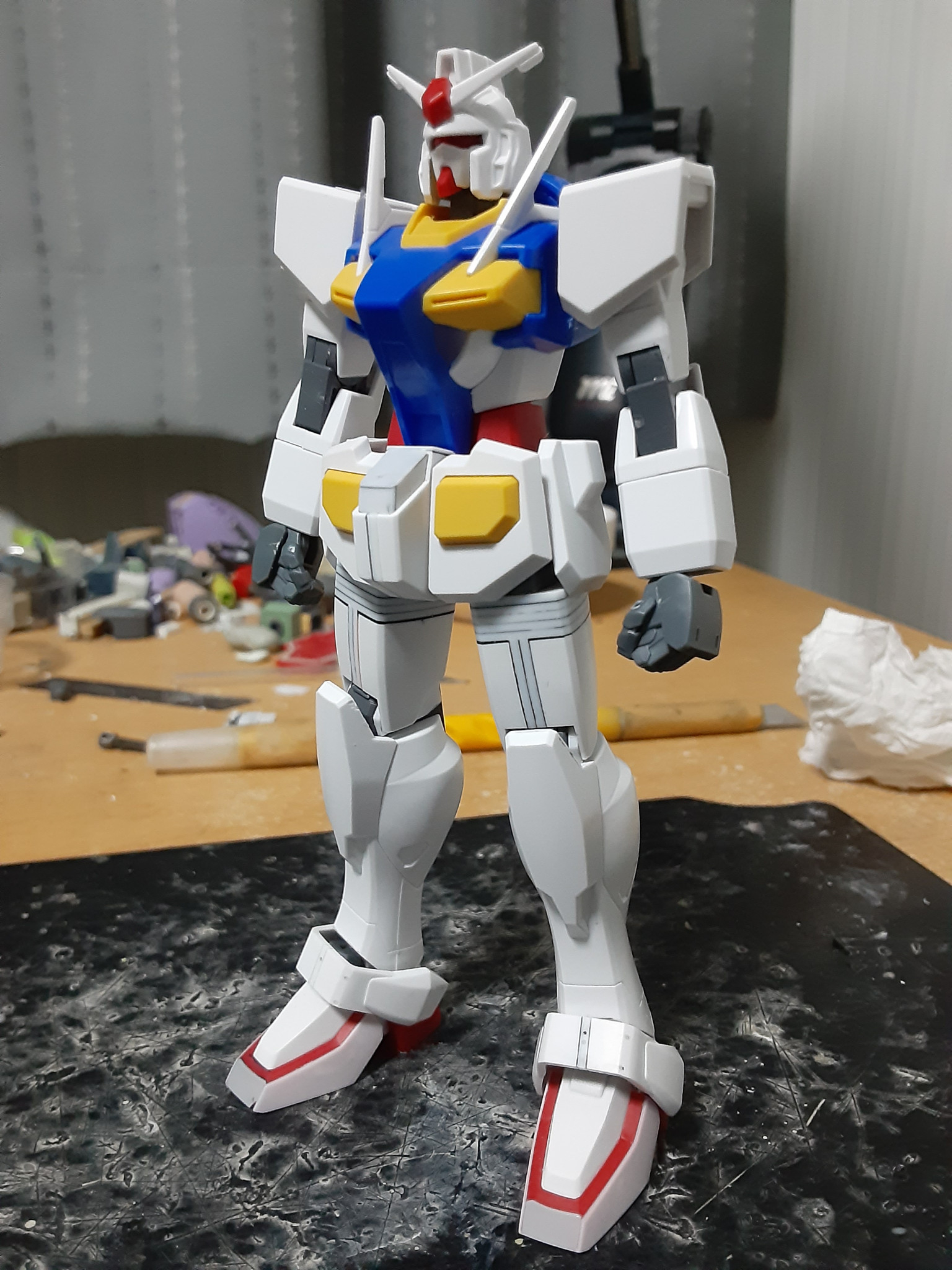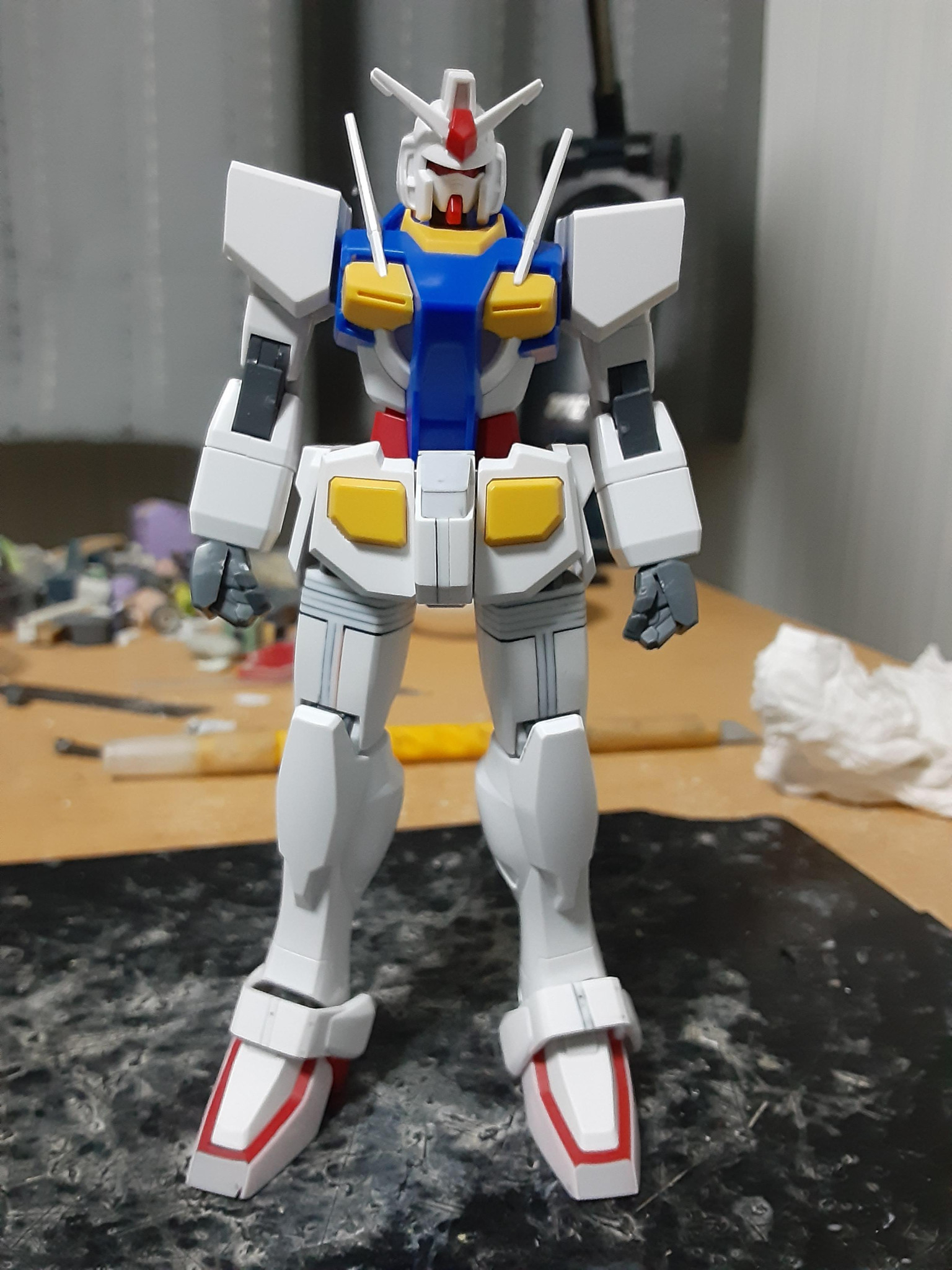 下半身の工作が終わった0ガンダム(正確にはスネ横の合わせ目消しがまだだけど)。バランス確認のため、上半身を乗せてみた状態がコレ。