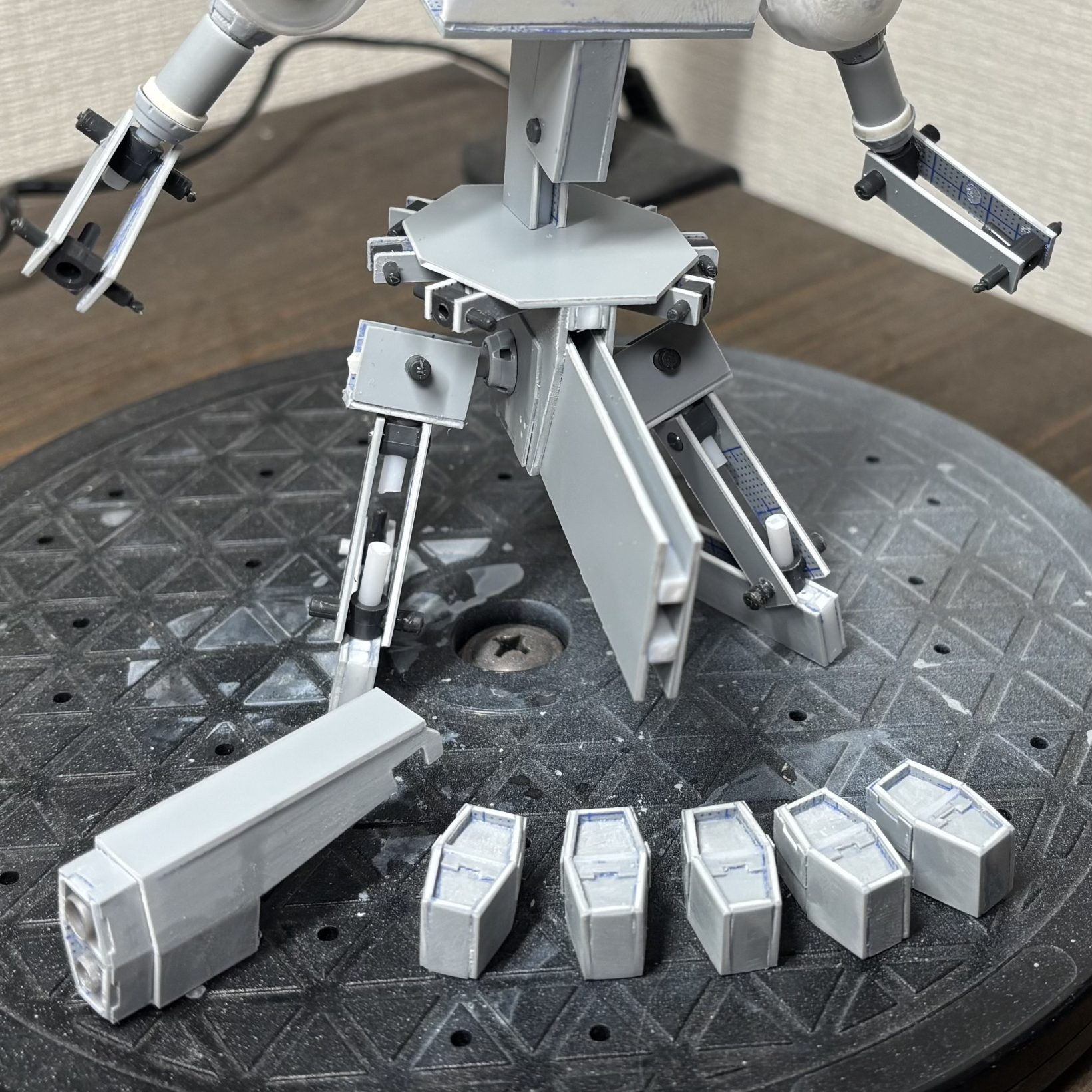 ますらお 2025.12/07更新 パーツ量産とサイドアーマー「陸戦型〇〇(フルスクラッチ)」制作中 80 26 いいねしたモデラー(26) 11 作品を共有 サイドスカートに組み込むバーニアパーツを6個量産中。とりあえずサイドアーマーの真ん中部分をこさえて、サイズ感確認。6角パーツも取り外し可能に出来てるし、いい感じかな。 制作中 コメント コメントをして応援しよう コメントにはログインが必要です meg-ocero 35分前 この形状の複数制作はかなりの重作業ですね😵 同じに切り出したつもりなのになぜかひとつふたつサイズ違ってたりして組み上げてからなんでじゃー😫てなるやつ(笑) Ojipop 3時間前 再び大量生産ーー😱 正気は保てるのかーー😱 オイラは無理ーー😂 ますらお 2時間前 ふふふ、この機体をフルスクラッチしようと決めた時点で正気かは怪しい(gandam1) cinnamon-1 4時間前 着実に進んでますね😁 部品の量産まで😊 私なら心が折れてます😅 頑張ってください👍 ますらお 2時間前 ありがとうございます(zaku-kao2)フルスクラッチやる上で複製技術を使用不可の縛りプレイなので、精神コマンド使って乗り切ります! グフカス大好き 11時間前 これってやっぱりアレですよね あれに出てくるあんな色の機体ですな まぁ秘密にしときます グフカス大好き 11時間前 まぁわかってねぇけどね ますらお 11時間前 このアーマーが全部腰に刺さると流石にバレますね(zaku-kao5)ザクカラーのあんちくしょうです グフカス大好き 9時間前 あやつか 地獄からの使者ですな バレーボールおじさん 11時間前 同じものを作るのって大変よね…どうなっていくのか楽しみ(zaku-kao8) ますらお 11時間前 同じもの作る時は量産分パーツを切り出しておくと、組み上げ繰り返しになるのでそんなに辛くないんですが。一個づつ切り出して組み上げしてると心がばっきり折れます(zaku-kao9)頑張りますよー ますらお 未熟者ですがよろしくお願い申し上げます。 地球の重力に魂を縛られた中年。地上戦兵器を作り倒したい。 引き算のデザイン?…戦いはボリュームだよ兄貴ィ! 基本すぐ何かしらスクラッチをしないと気が済まない性分…基礎工作、塗装技術を鍛錬中。 ますらおさんがお薦めする作品 ガンタンク現地開発機(モノサロス) HGUC ドワッジ(HGUCドム改修) デザート・ザク キャノンカスタム 陸戦型ゲルググ(HGUC改修) 9 重力圏海兵隊仕様 マラサイ 連邦という組織内でティターンズとは派閥を隔てた上層部もいたの… 8 陸戦型ガルスJ 塗装が台風被ったせいか湿度でノリが悪く苦戦しまくりましたが、… 9 陸戦型ジム 市街地戦仕様 塗装機材トラブルなどで途中で機材変えたりで少し塗装がうまくい… 8 デザート・ザク キャノンカスタム ピンク・パンサー隊のデザート・ザクをベースにカスタム機体を作… ますらおさんのページ この作品をお薦め作品に設定する Please login to update your profile! Please login to update your profile! Please login to update your profile! Please login to update your profile!