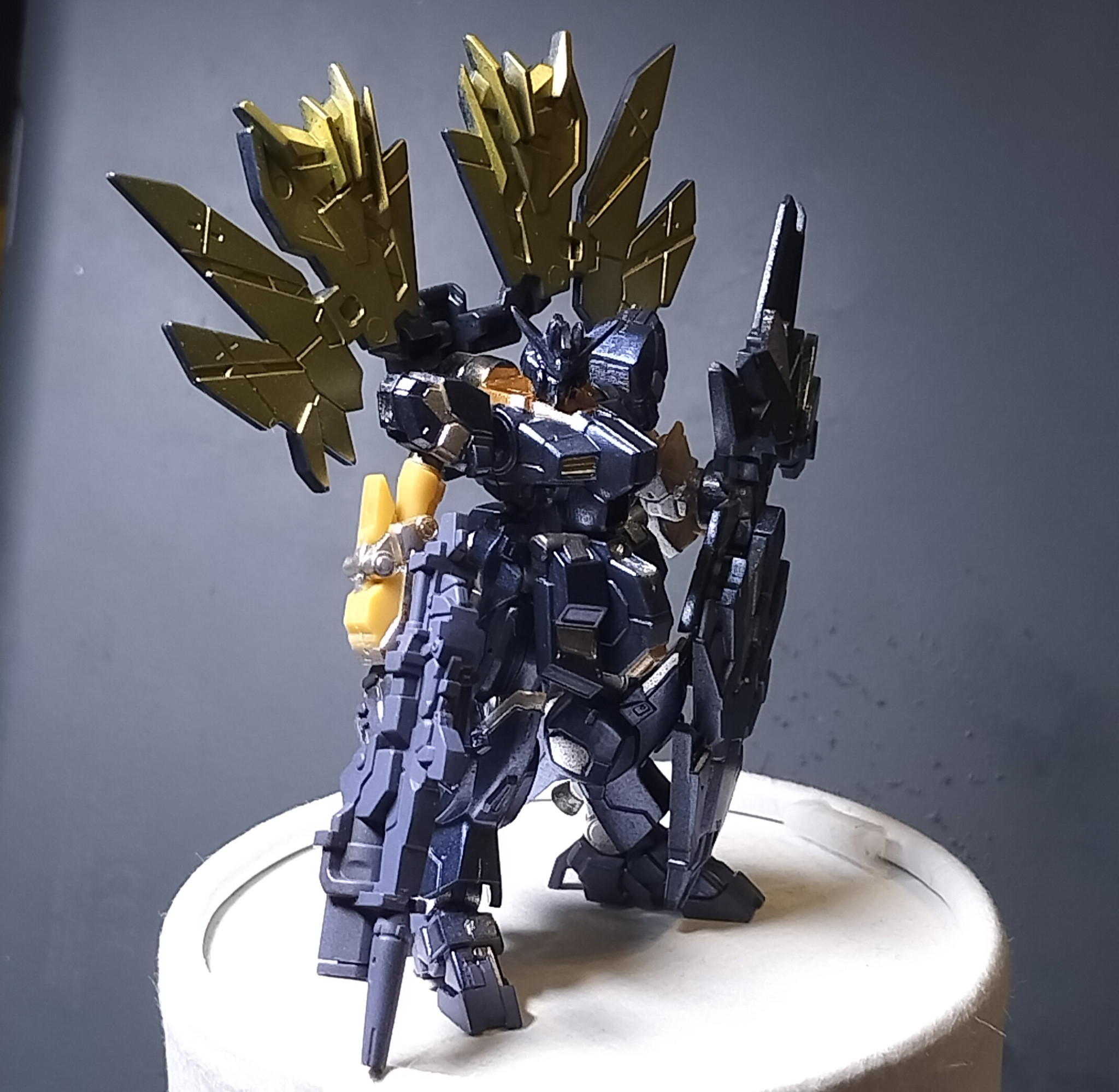 ガンダムマーカーメタリックセットのダークブルーメタリックがプリズムブルーブラックみたいにかっこよかったので、ちゃんとマスキングしてしまいました。セミガチくらいにはなってしまった。