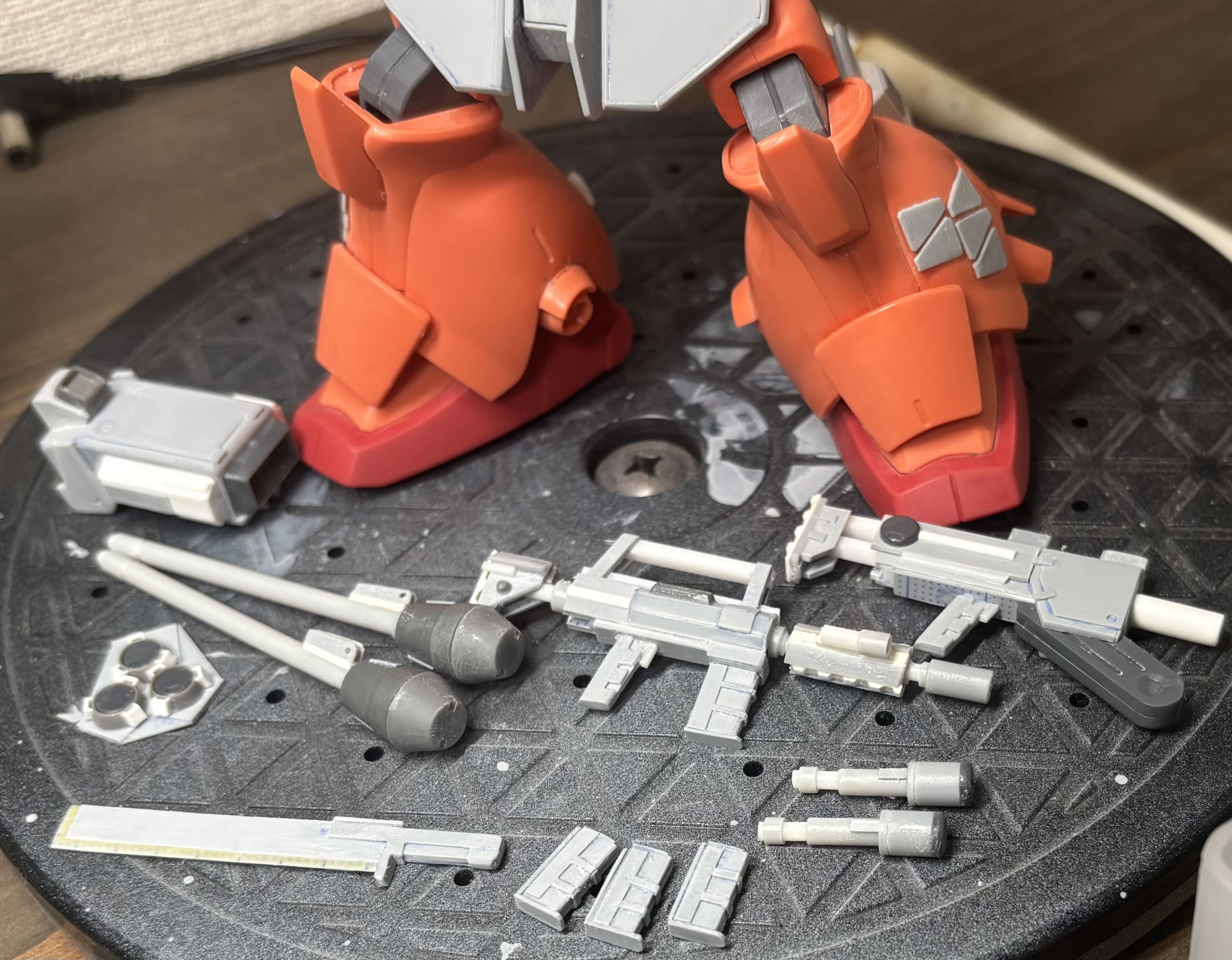 武装のスクラッチは基本こんなトーンで、プラパイプの口径違いを重ねて銃口にして、0.3/0.5/1mmプラ板を組み合わせで作っています。