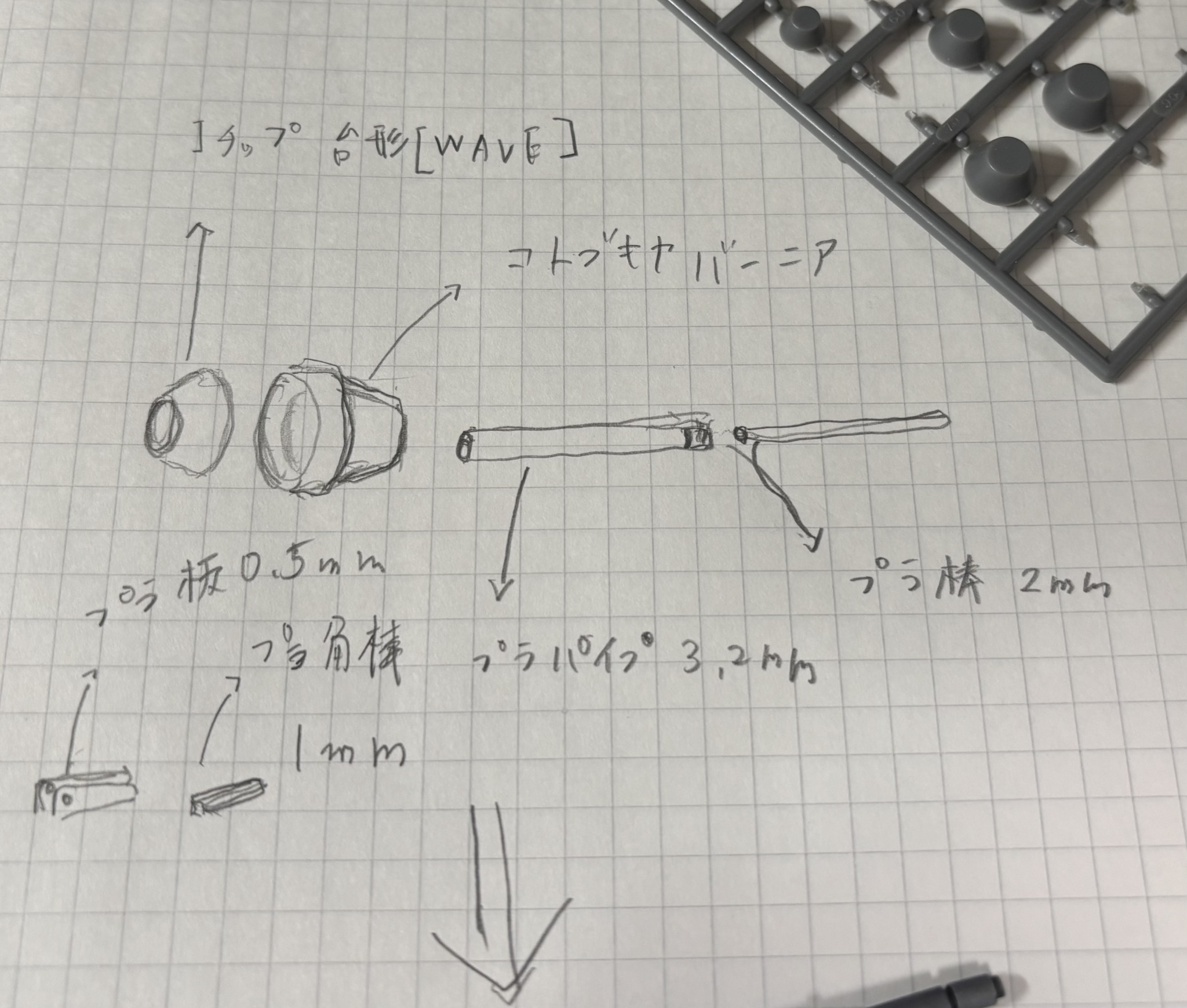 写真の手書き通りなトーンで組み合わせて作っています。コツは必要な本数分材料を切り出して、サイズを合わせること。※4.2mmプラパイプ書き忘れ