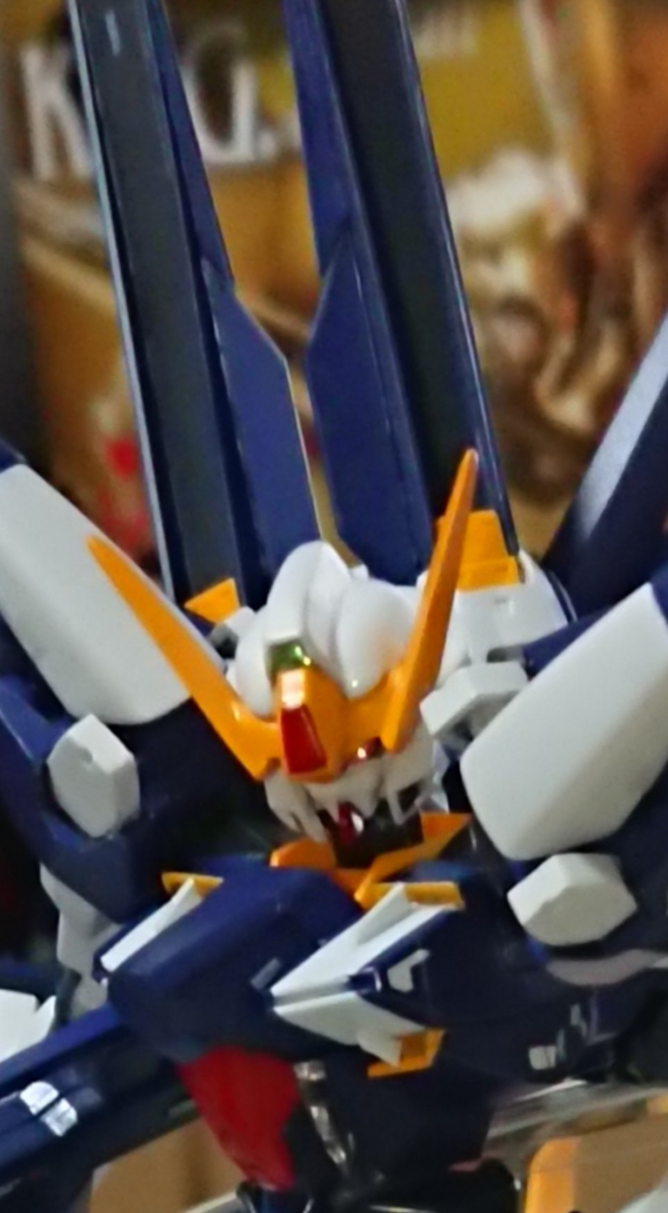 写真4枚目、ワンダースワンのGジェネタイトルを参考に、一回り大きいネイルストーンシールを使い、眼の外円付近のみ蛍光ピンク塗装、真中は塗らずにそのままのクリアーにした所、見事にハイライトが入った。