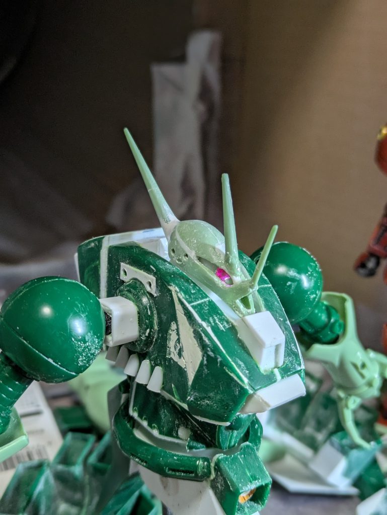 頭部のサイドアンテナは、ケーブルが設定と違ったので、代替パーツを検討するため外してありますか、モノアイは5ミリのジュエルシールを付けたので、表情が出たと思います。