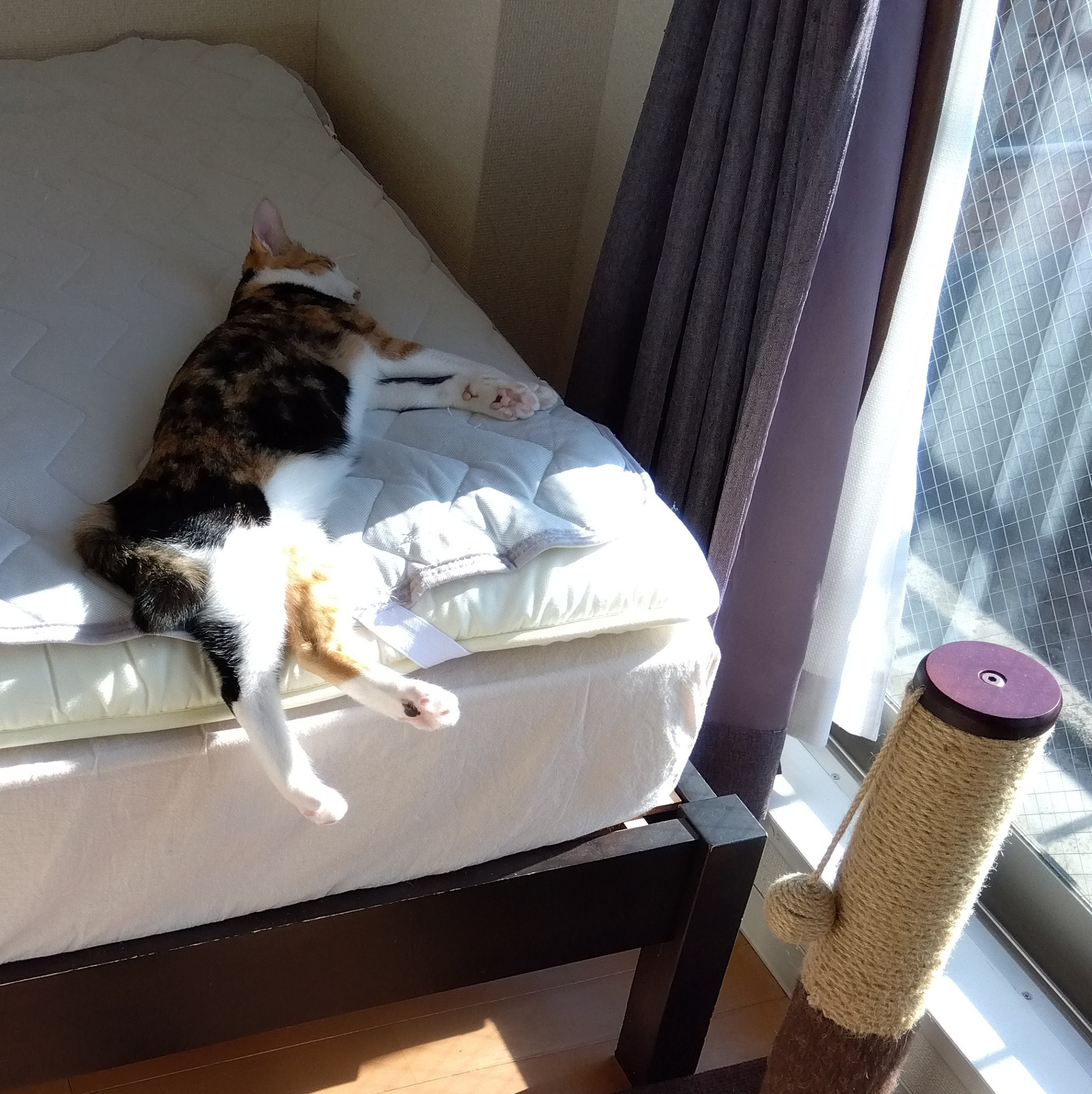 うちのニャンコも朝から布団の上でスヤスヤしとります