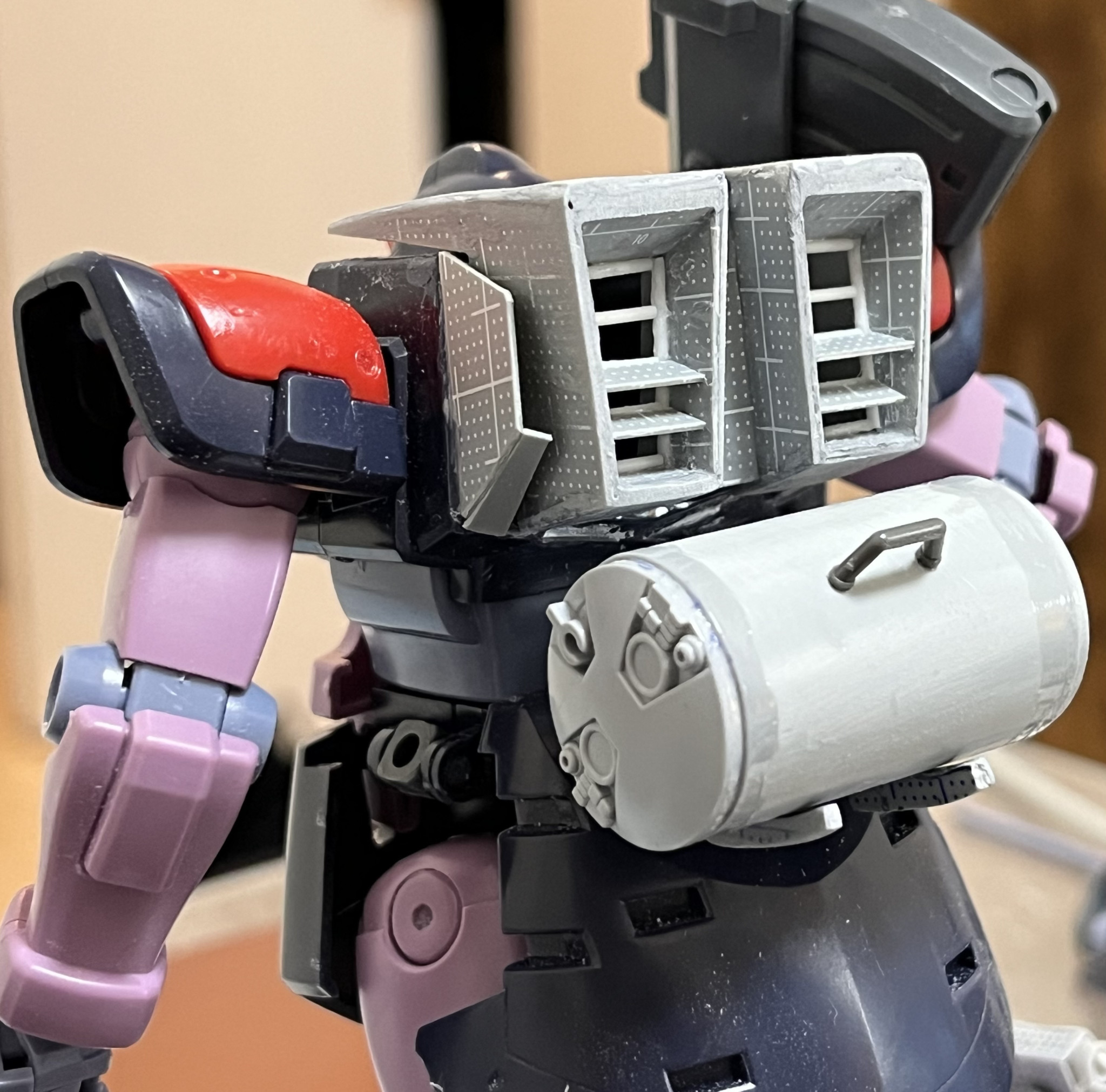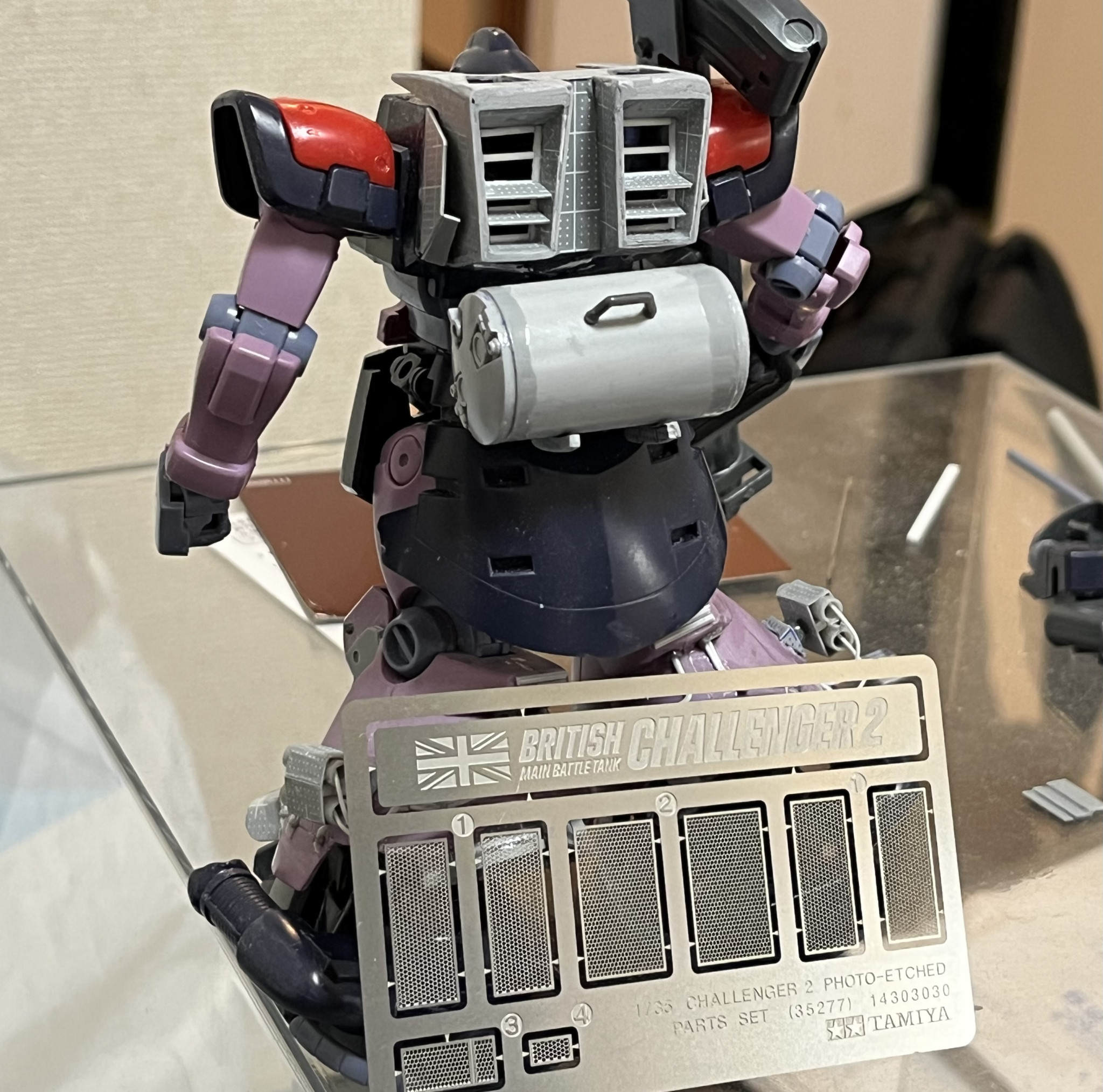 バックパックの大枠が出来上がりました。三度目の正直…やっと納得の仕上がりです。バックパックと脹脛の排気口にフィルターメッシュを裏打ちすべく何年か振りにエッジングパーツを購入しました。ガンプラでエッジングパーツ使うのは今回が初めてです😅かなり目立つ大きさの排気口なのでそれなりに作り込む必要があるかなと思いました。タミヤ製で1/35🇬🇧チャレンジャー戦車の排気口のメッシュです。数カ月ぶりにタムタムに行きまして1,500円位覚悟してたのですが見付けたモノは700円でした。サイズもドンピシャでラッキーでした。バックパックのメッシュの奥が透けて見てしまったらある程度中身も作る必要があるかもです😭