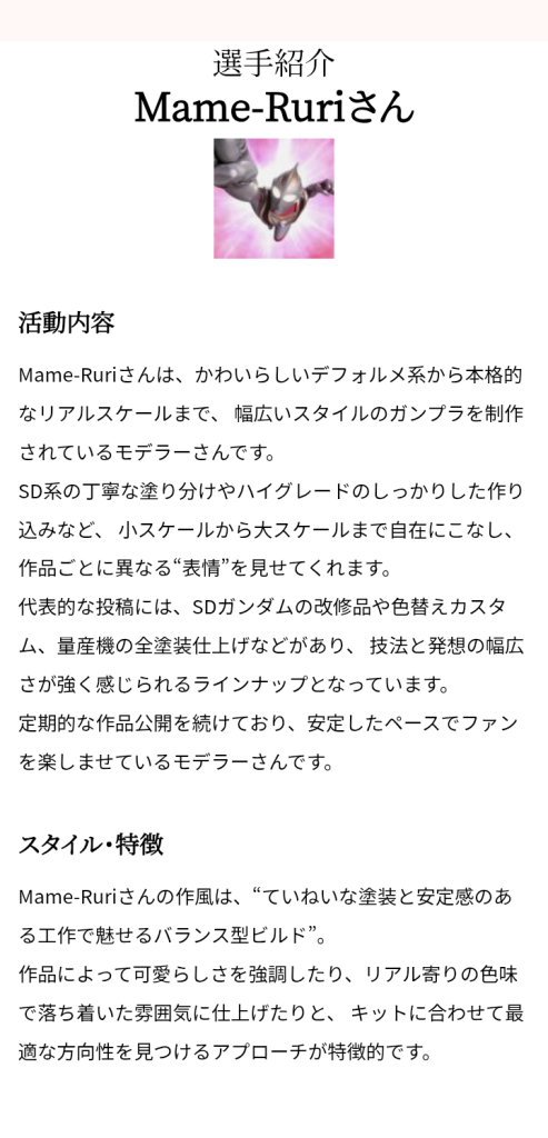 Mame-Ruri 2025.12/22更新 ちょっとAIさん! 24 9 いいねしたモデラー(9) 0 作品を共有 紅白合戦の紹介文、なんかSDメインの人みたいになってるwたぶんSDは作ったことすらないのに😂 いや面白いから別にいいんですけど、AIもまだまだ発展途上のテクノロジーってことですね。 ちなみに私は去年に引き続き紅組です。 ザクタンクと並行して、今年はちゃんと赤い…通常の3倍の…マスクのコメットさんでも作ろうかと。 しかし!間もなく妻が仕事納め!保育園も冬休み!時間がなああーいッ! 制作中 コメント コメントをして応援しよう コメントにはログインが必要です Mame-Ruri 筆塗りとエアブラシで模活と子育て奮闘中の1児の父。 好きな作品は アニメーション 初代『機動戦士ガンダム』 OVA『ポケットの中の戦争』 『機動新世紀ガンダムX』 ゲーム ドリームキャスト『コロニーの落ちた地で』 PS2『ジオニックフロント』 PS3『ターゲットインサイト』 ゲーム登場機体の他、『こんな機体もありそう…?』な各作品の時代に沿ったオリジナル機体をよく作ります。 皆さんの作品で勉強しつつ、GUNSTA楽しみたいです! 気軽にコメントください!喜びます☺️ Mame-Ruriさんがお薦めする作品 MS-05S ゲラート専用ザクⅠ MSA-00? ユウ・カジマ専用MS TR計画 FSWS再評価試験機(仮) TR計画 高機動強襲試験機(仮) 10 MSN-07/E ズゴックE(蒼を受け継ぐ者ver.) 旧キットをゲーム仕様にプチ改造! 11 MSN-03/C ハイゴッグ(蒼を受け継ぐ者ver.) 旧キットを大改造! 11 MS-09 ドム(戦慄のブルーver.) フィリップ「ジオンのエースのご登場ってわけか…!」 11 RGM-79D ジムD型 (モルモット隊) 旧キット+B-CLUB換装キット Mame-Ruriさんのページ この作品をお薦め作品に設定する Please login to update your profile! Please login to update your profile! Please login to update your profile! Please login to update your profile!