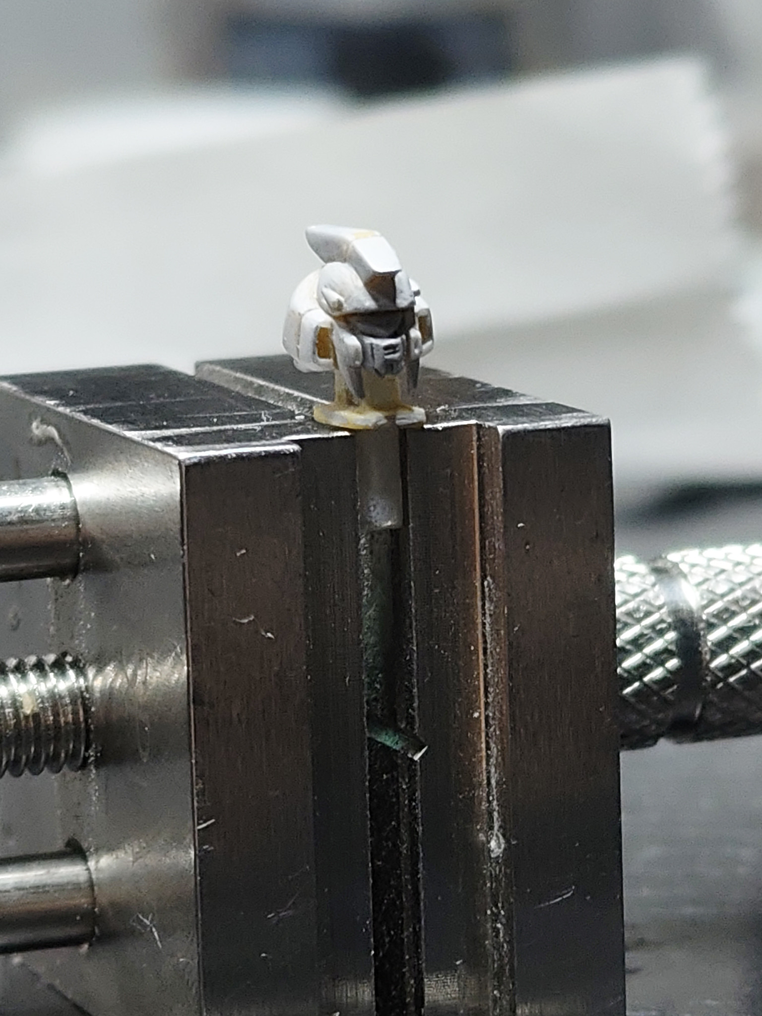 ③頭部は3パーツ構成にしました。今までの改修はフェイス部分を別パーツ化して、2パーツ構成でした。しかし、最後にフェイス部分をスライドしてはめ込む時にうまく入らない、ラピーテープの目が取れたりと苦戦するのでアーティファクトのガンダム系のひさし&角で、上記の問題を解決することにしました。口も別パーツ化することでシャープ化、塗り分けがきちんとできる利点を得れると思います。問題点は、小さすぎてピンセットではじいて紛失しまくりです(-_-;)
