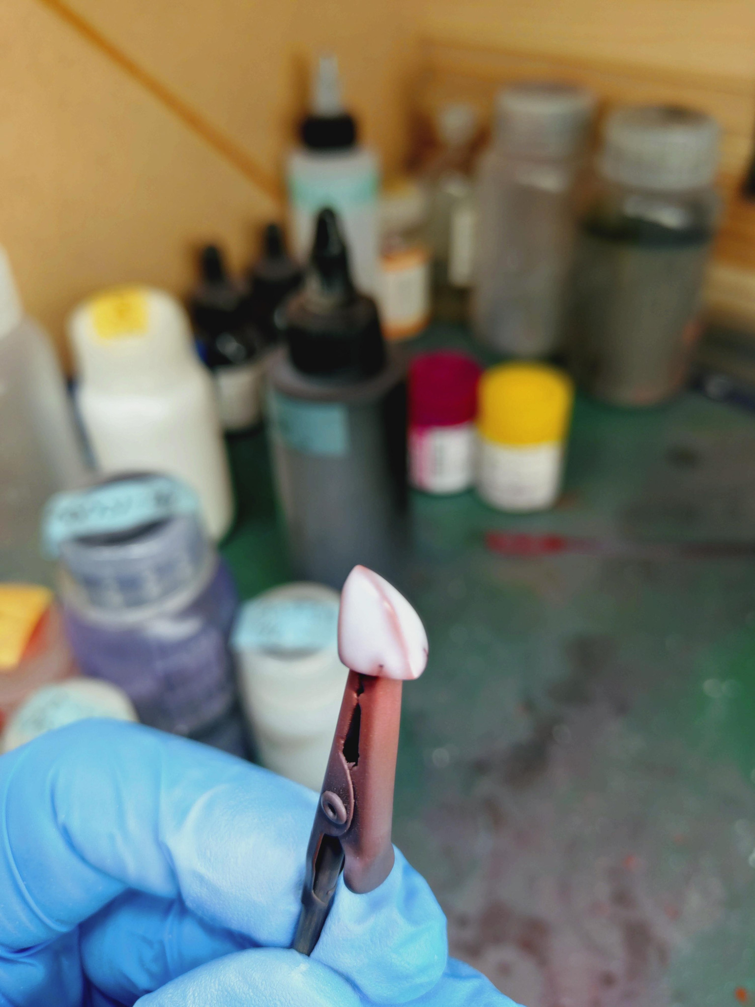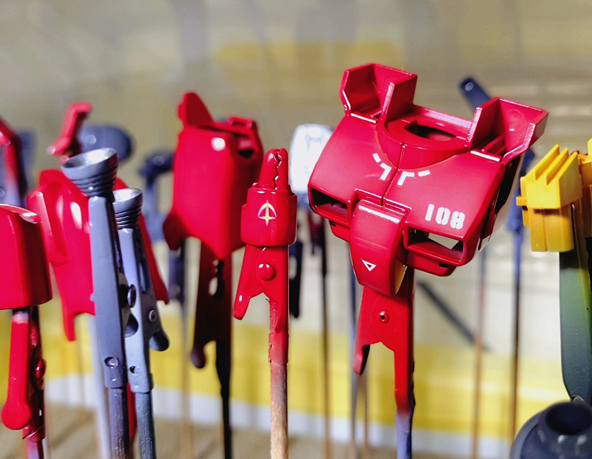 そのあとに、赤い色にはブラウン、黄色にはオレンジなどの下地を塗装して白色などでハイライトグラデーションを入れていきます。