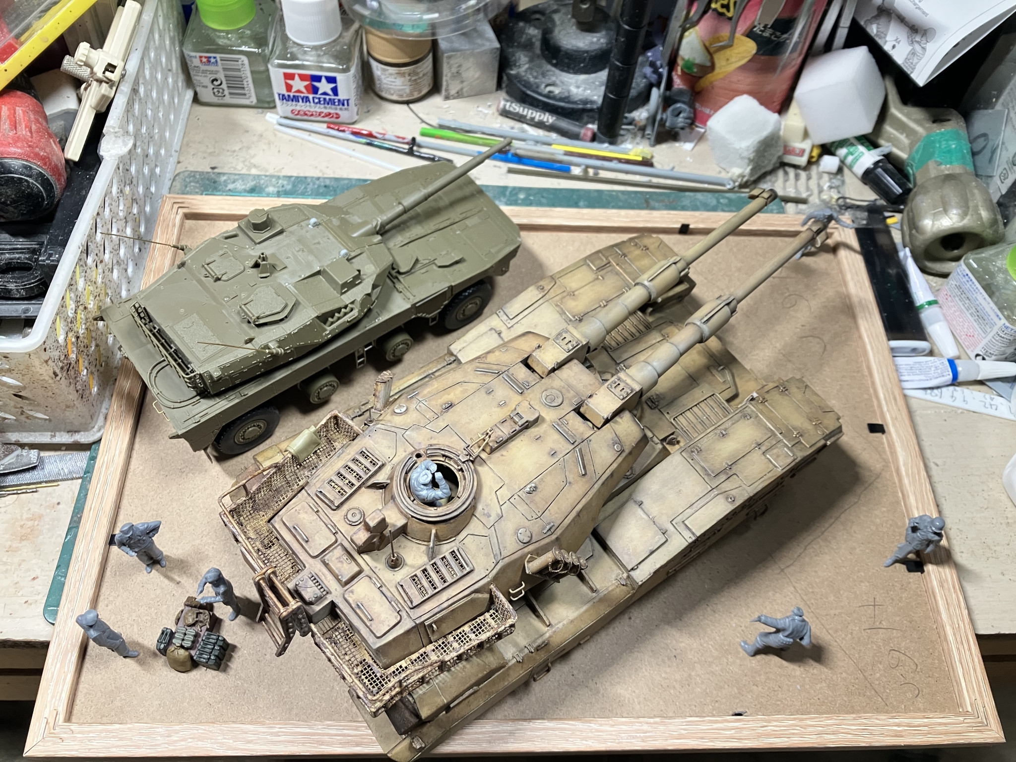 要らぬおせっかいかもしれませんが16式まで配置すると詰め込み過ぎの感がある様に思います。61式のみとし16式のスペース分61式を奥に配置して手前のスペースを開け61式を枠内に収め、じつくり見せる形はどうでしょうか?周囲の情景をもう少し作り込める様にスペースを取った方がジオラマとしては見応えがある様に思います。生意気な事ばかり言ってすみません。