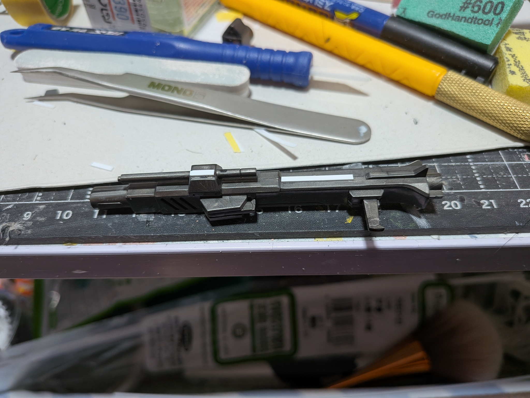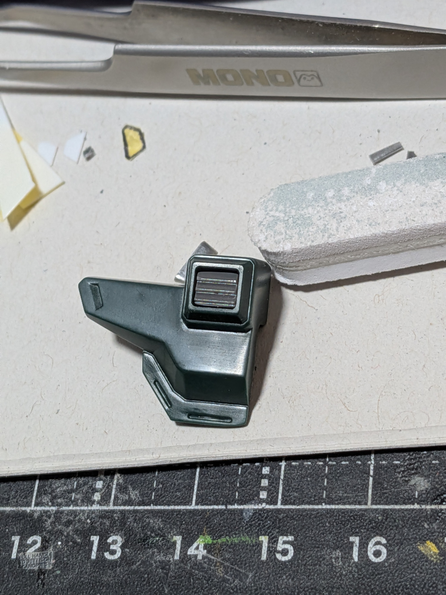なんとか肩アーマー後ろのダクトに市販パーツ入りガンランチャーに平棒使ってペタペタ貼り付けてみました。