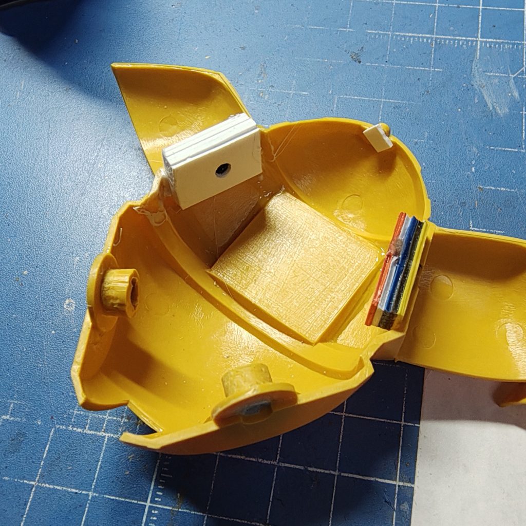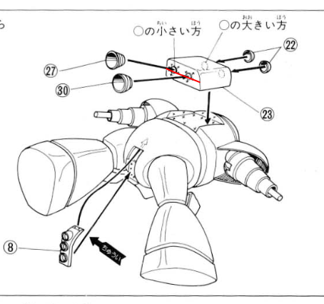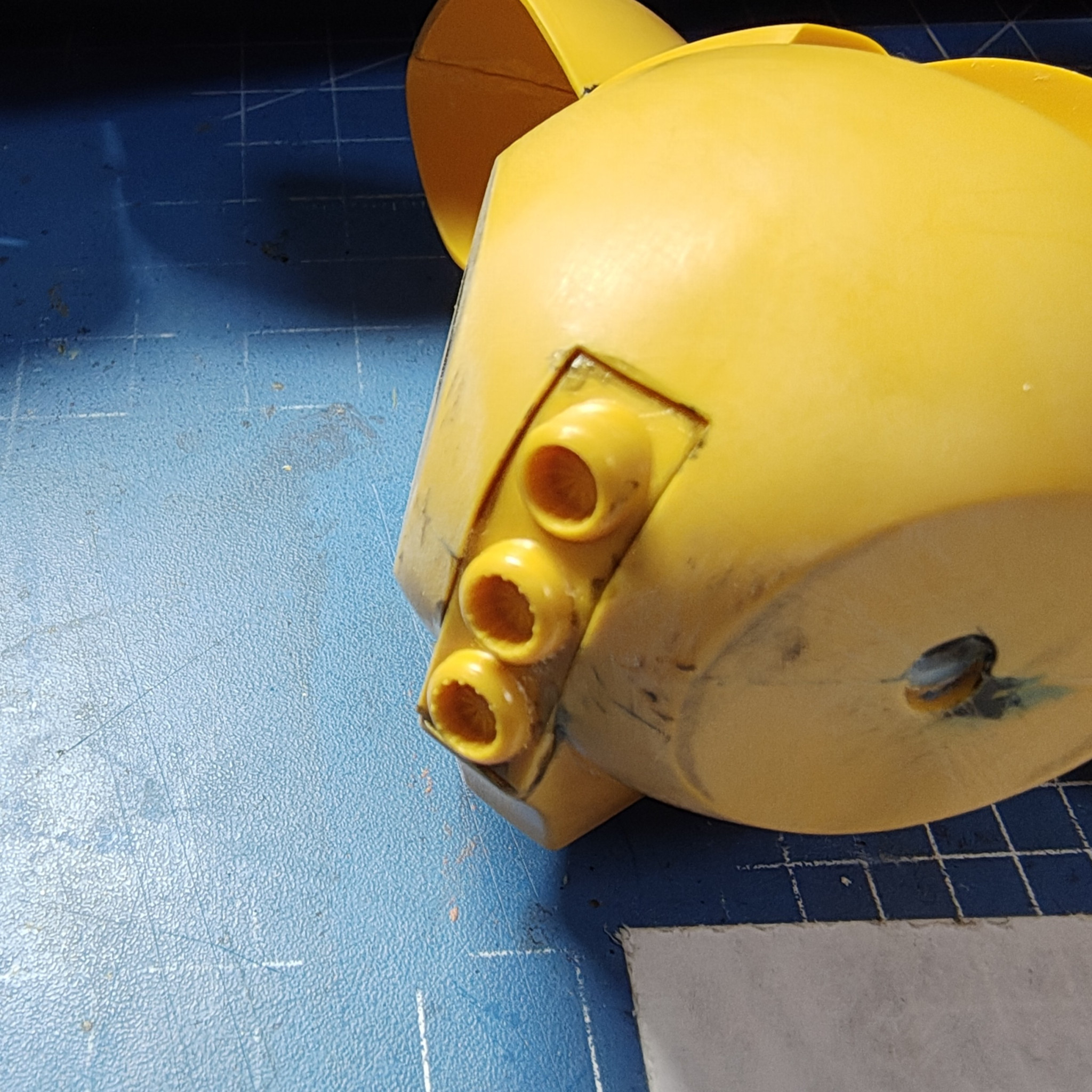 (1) 腕の受ける方はプラ版orランナータグに5mm穴あける。足を受ける所は本来太股側と接着してハメる構造の部品の穴を5mmに広げる。アイロンビーズ入れて本体に接着。あと頭の頂点の機雷対策の何かを噴出する穴が合わせ目を跨いでいて消せそうになかったので開口して、蓋して3mmランナーで適当な噴出口を作成。