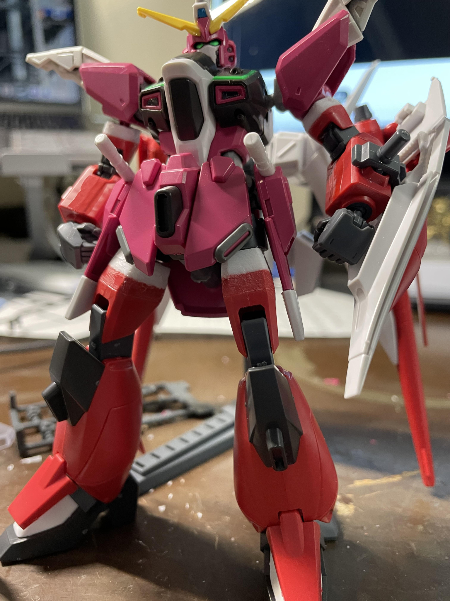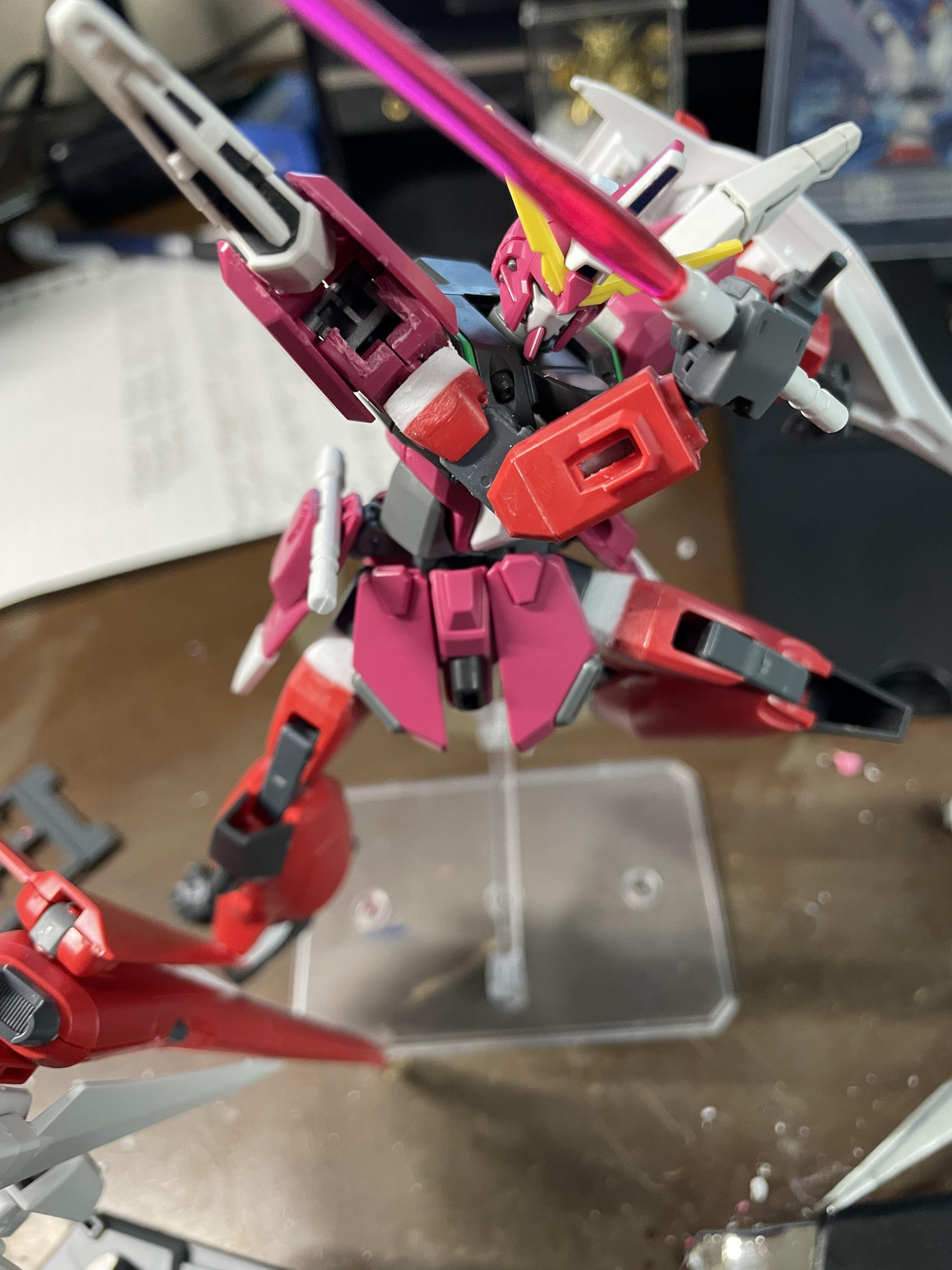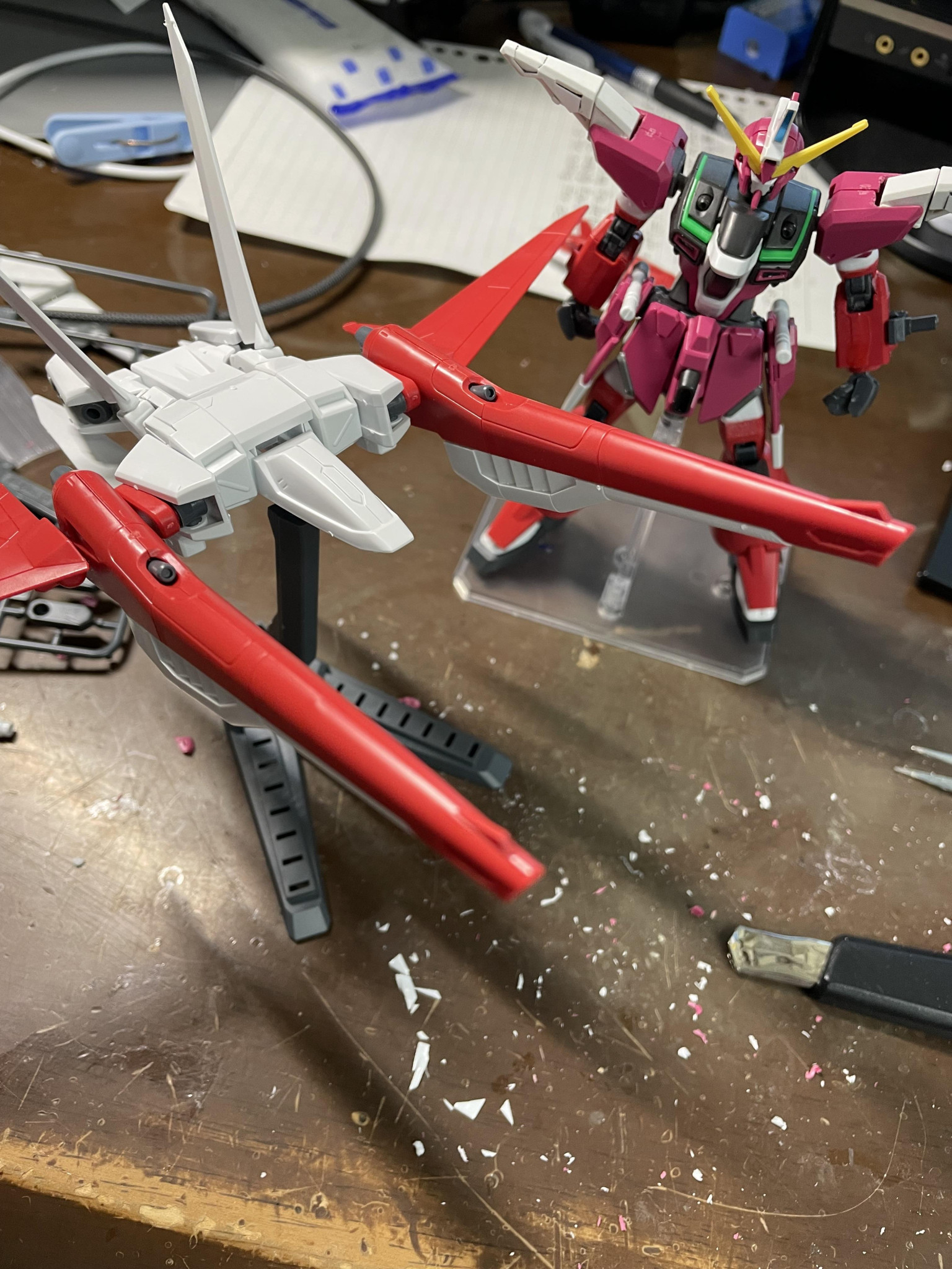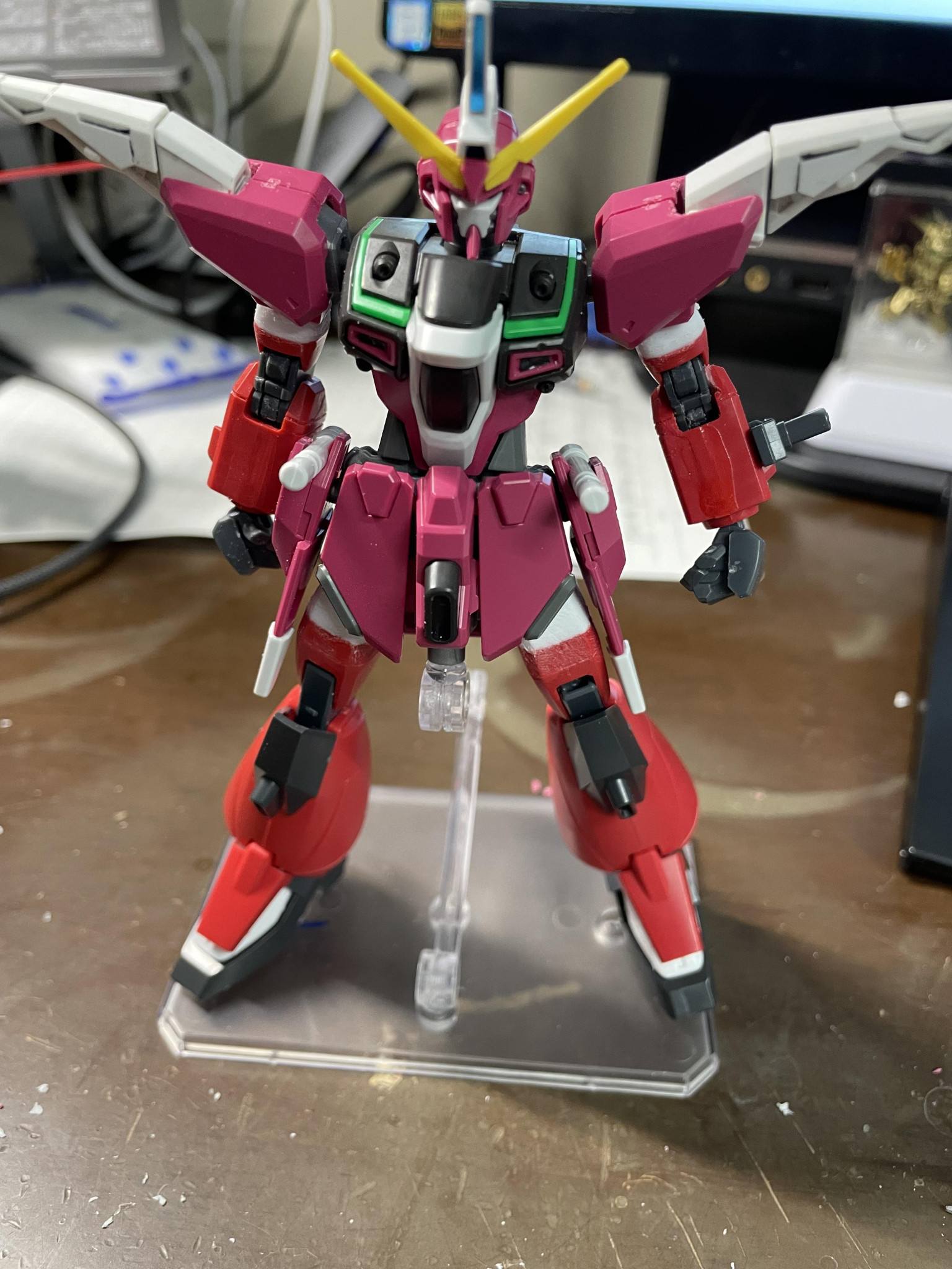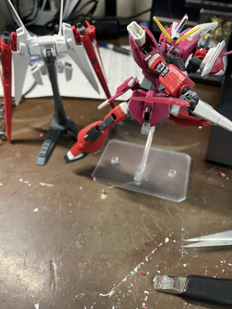 足と腕はセイバーのものを、肘関節はHGUCZガンダムの物を使用、肩は加工してRGジャスティスのビームブーメランを装備、胴と腰、肩に頭はインフィニットジャスティスの物を、バックパックにはギャラクシーブースターを使用しようと考えています。かなり可動域も良好、スタイルもめちゃいいのでガンプラやってて久しぶりにここまでワクワクしてます!