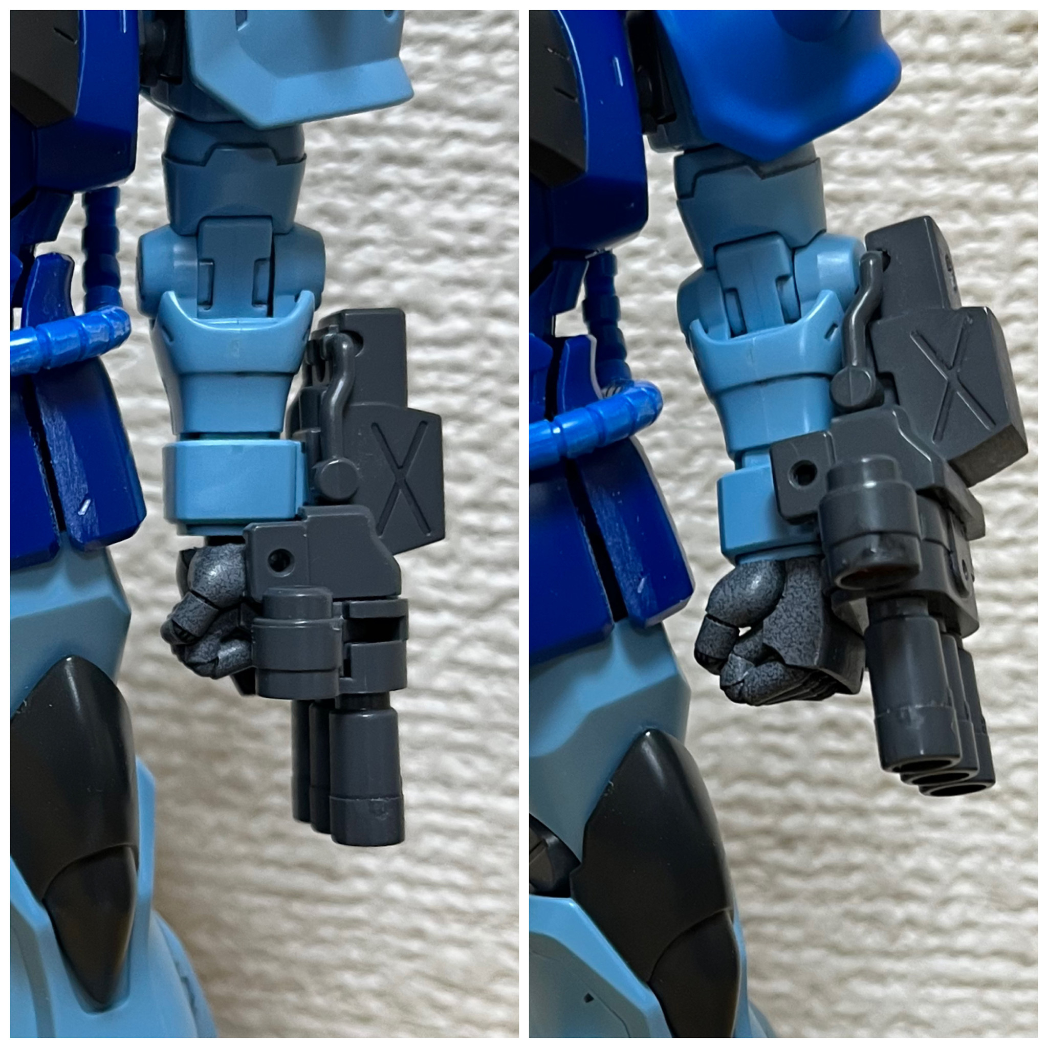 ミキシングのビフォー・アフター。肩はリバイブのほうが小さくて自分好み。肩のとげとげはプラ棒をつけて削って尖らせました。スタイル改修箇所・首を延長・太ももを幅増し・腰・膝関節にポリキャップを挟んで延長・左腕の三連ガトリングの接続位置を調整その他の改造箇所・シールド グフカスタムのは小さいので、リバイブ版を採用。ヒート剣がさせるように裏の部品を移植・右上の前腕にあるヒートロッドは銃持ちでジャマなので腕の後ろ側に移植・マシンガンを切った張ったで改造。ドムトローペンのをベースにストック部を陸戦型ジムのものと交換。銃身を切り詰めて、サプレッサーを付けた(3枚目)