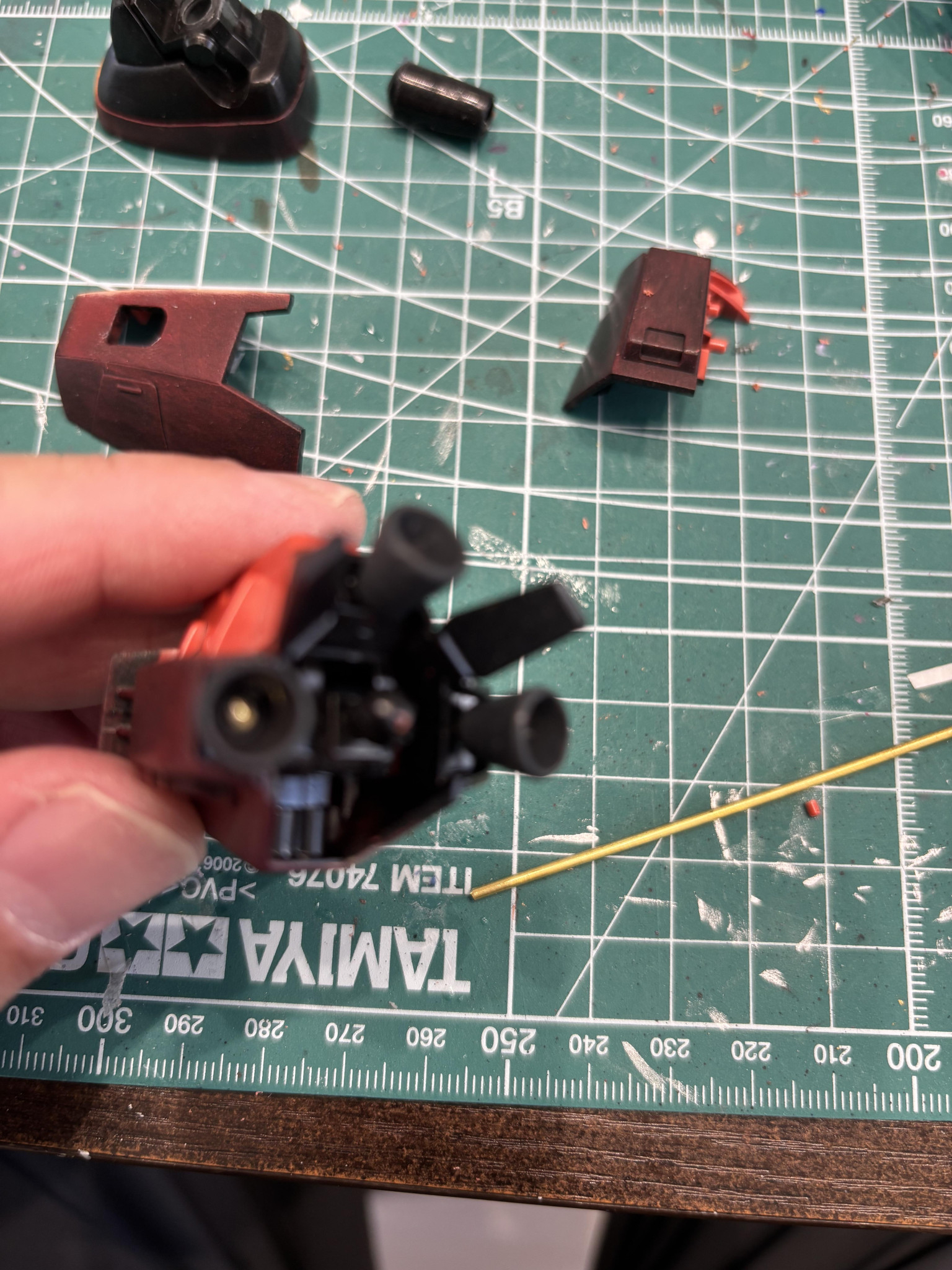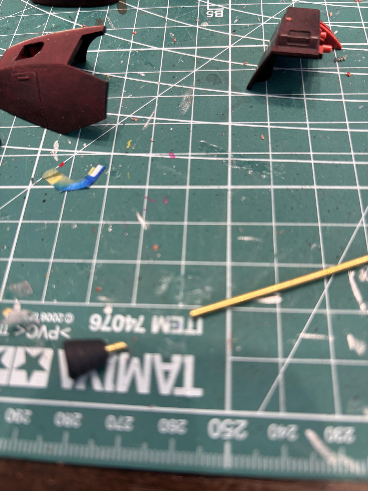 ジョニーライデンザクⅡですが、押し入れから出してきたキットだということもあり、脚部バーニアのピンが全て折れていました。半完成状態でしまっていた際、落とすかぶつけるかしてバーニア三つピンごと折れたのでしょう。というわけで補修作業開始です。