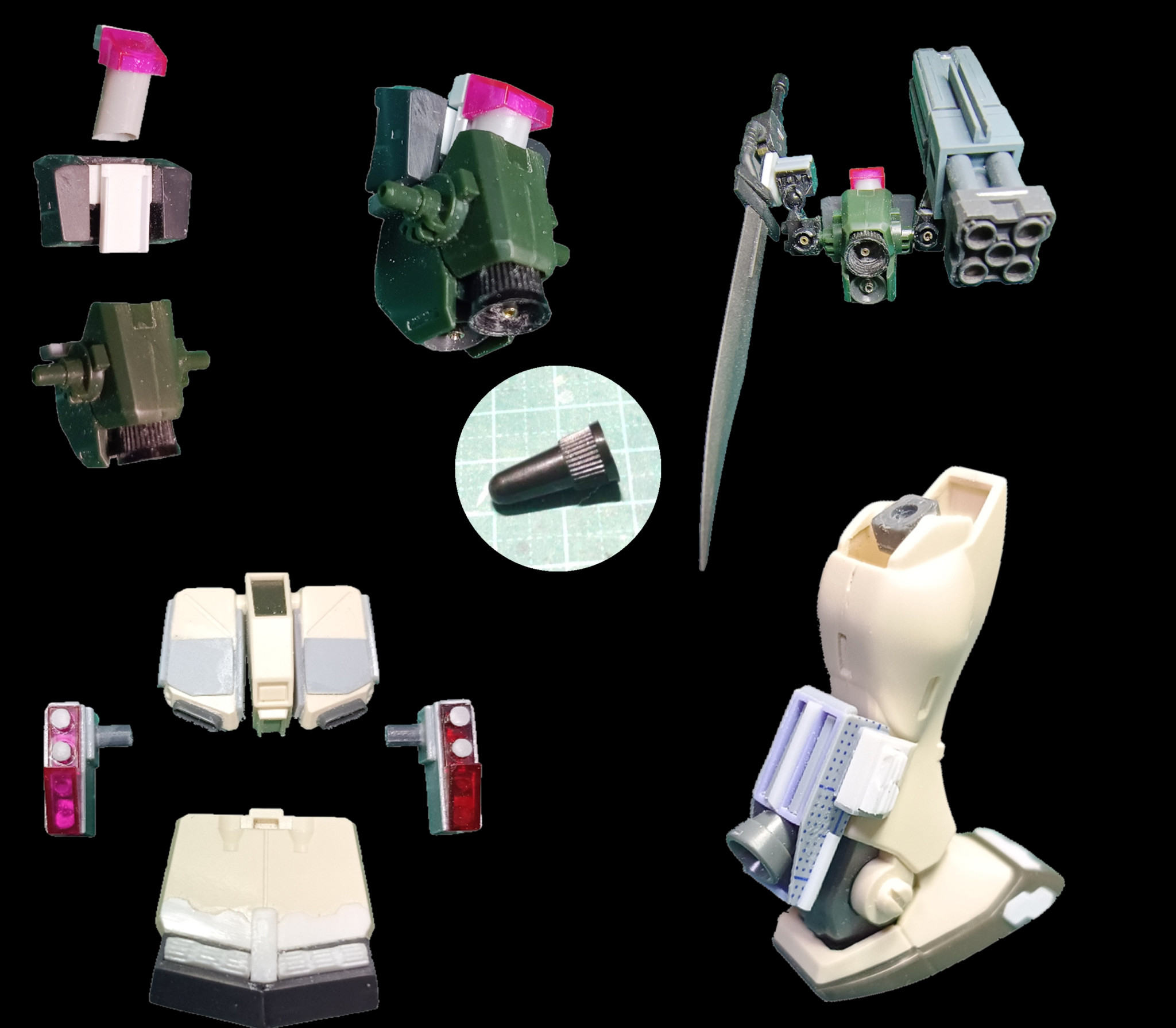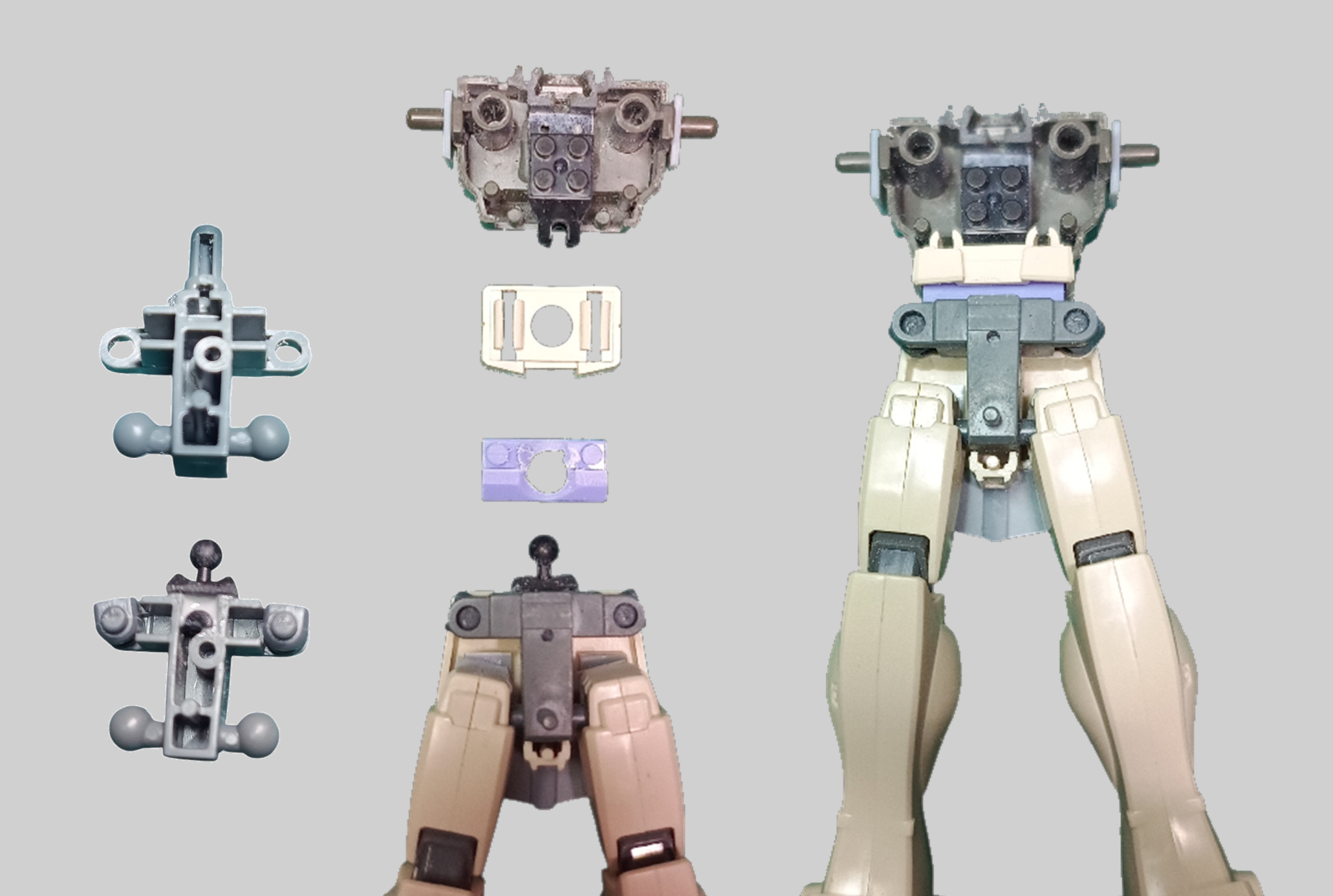 関節:DSO-BLKのボールジョイントを移植。このままでは曲がらないので、腰を2mm(紫のDSO-BLK)延長。首回りも少し削って顎を引けるようにしました。