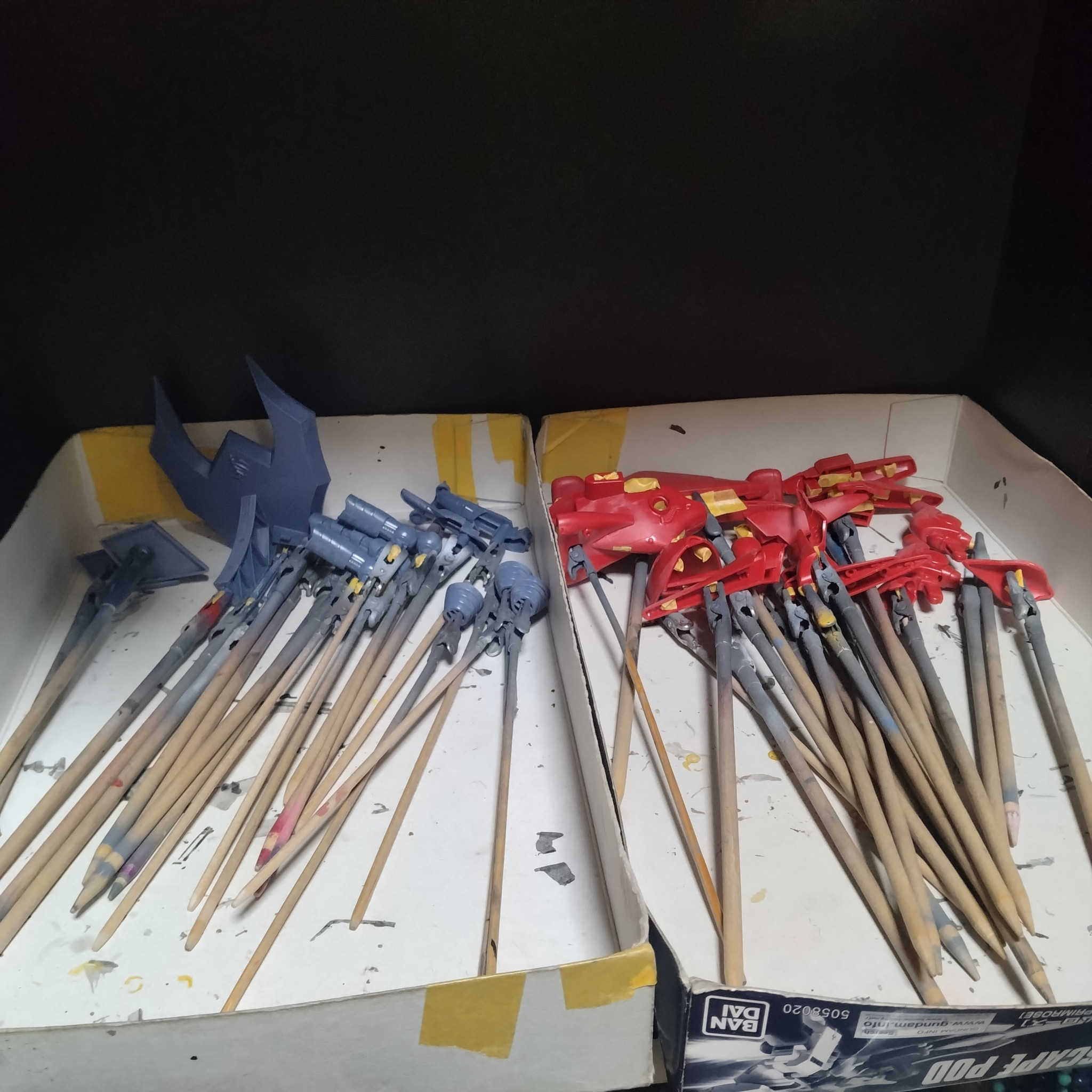 本日の何処かから塗装始めようと思ってますが、多分、夜からになるかなぁと思ってます!😄取り敢えず持ち手に付けてるわけですが!既に失敗したなぁと思ってる箇所もちょいちょい!😅後ハメ出来るパーツをシッカリ付けてしまってます!😅😅仕方ないので気休めですがマスキングして少しでも塗膜防御!しておくくらいです!😄まぁなんとかなるさ!くらいのモチベです!😄第一段階はサフを軽く吹かしていつも通りの滑り出しで!で今回はクリアレッドで機体色決めるので!肝は下地色で表現と全体のカラーリングが決まってきます!😀下地の色を決め!シャドー、ハイライト吹かしますが!ほぼこの時点で今回塗装するヴァル・ヴァロの雰囲気が決まってしまうので!最初からキチンと予測して塗装しないといけません!😄まぁまだこの時点で長々書いてもしょうが無いので!😄とにかく本日から塗装開始する事は決定です!😀