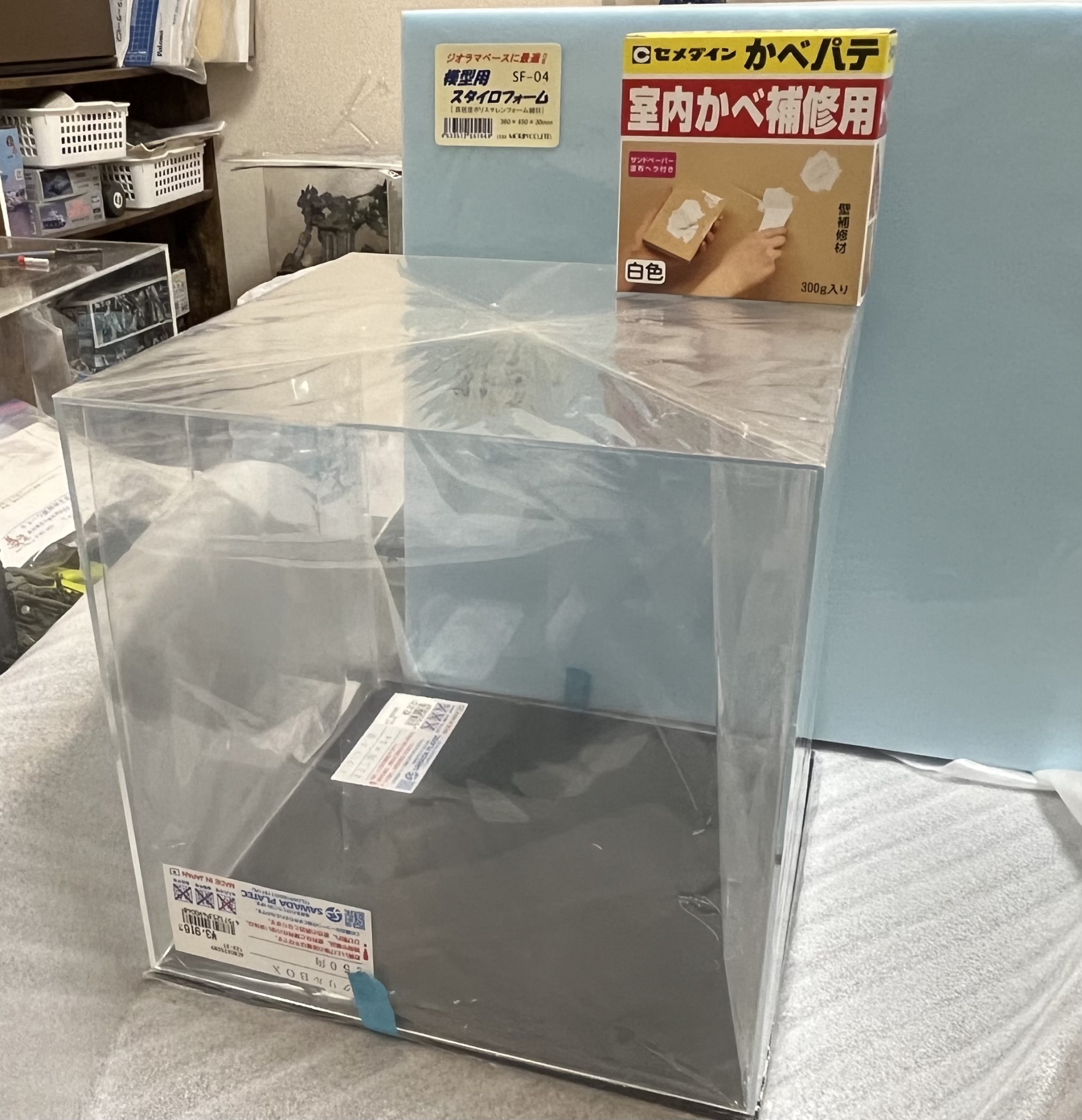ジオラマのイメージはこんな感じなんでしょうか…😅砂煙用に天然のコットン欲しいんですけど、何処に行けば売ってるんですかね…?以前、モノが無くて合成樹脂のコットンモドキを使った事があるのですが煙がまとまりづらくイマイチでした。先日ハンズで250角のアクリルケースと壁補修剤を購入しました。ハンズがスタイルフォームの販売を高額になってしまった事を理由に辞めてしまったらしく代わりにタムタムの鉄道模型コーナーで購入しました。持ち運び易い360×450×30サイズです。デカいサイズは車がないと無理ですね。これらは私がジオラマ作る際にいつも購入している物です。ジオラマはホコリを被ると掃除のしようが無いですからアクリルケースは私にとって必需品です…。