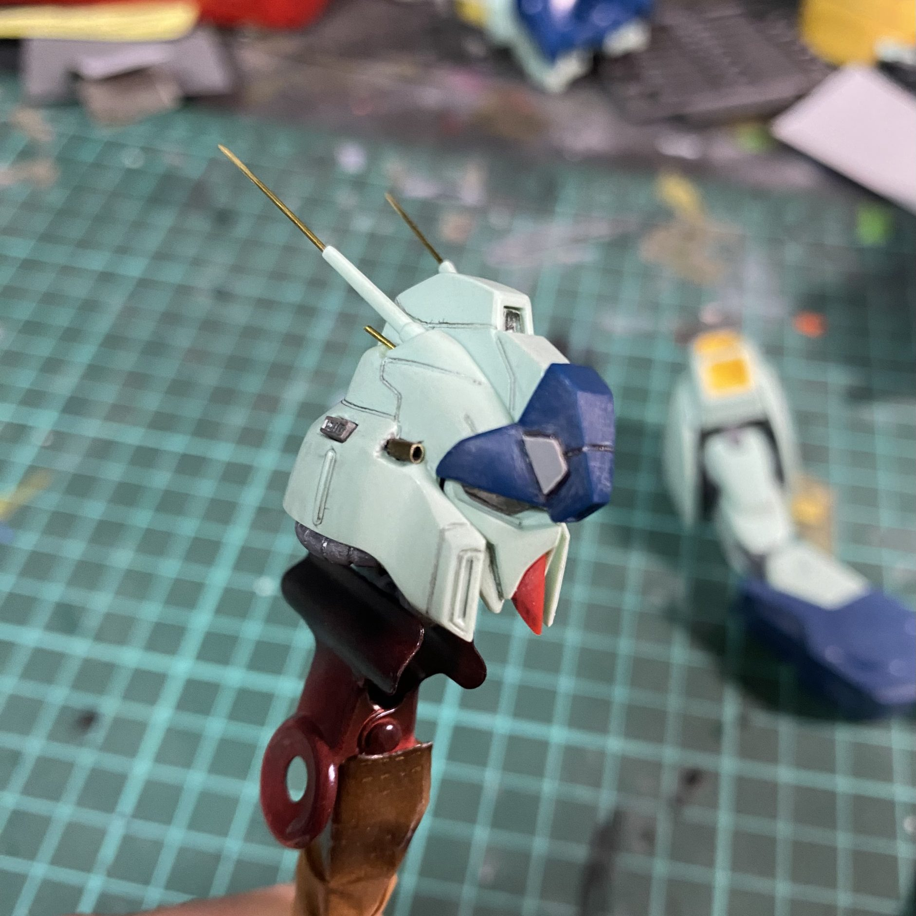 頭部は新規パーツなのでバランス良好です。筋彫り追加と頬ダクトの掘り直し。バルカンやアンテナを真鍮に。薬莢排出口は市販パーツを入れています。
