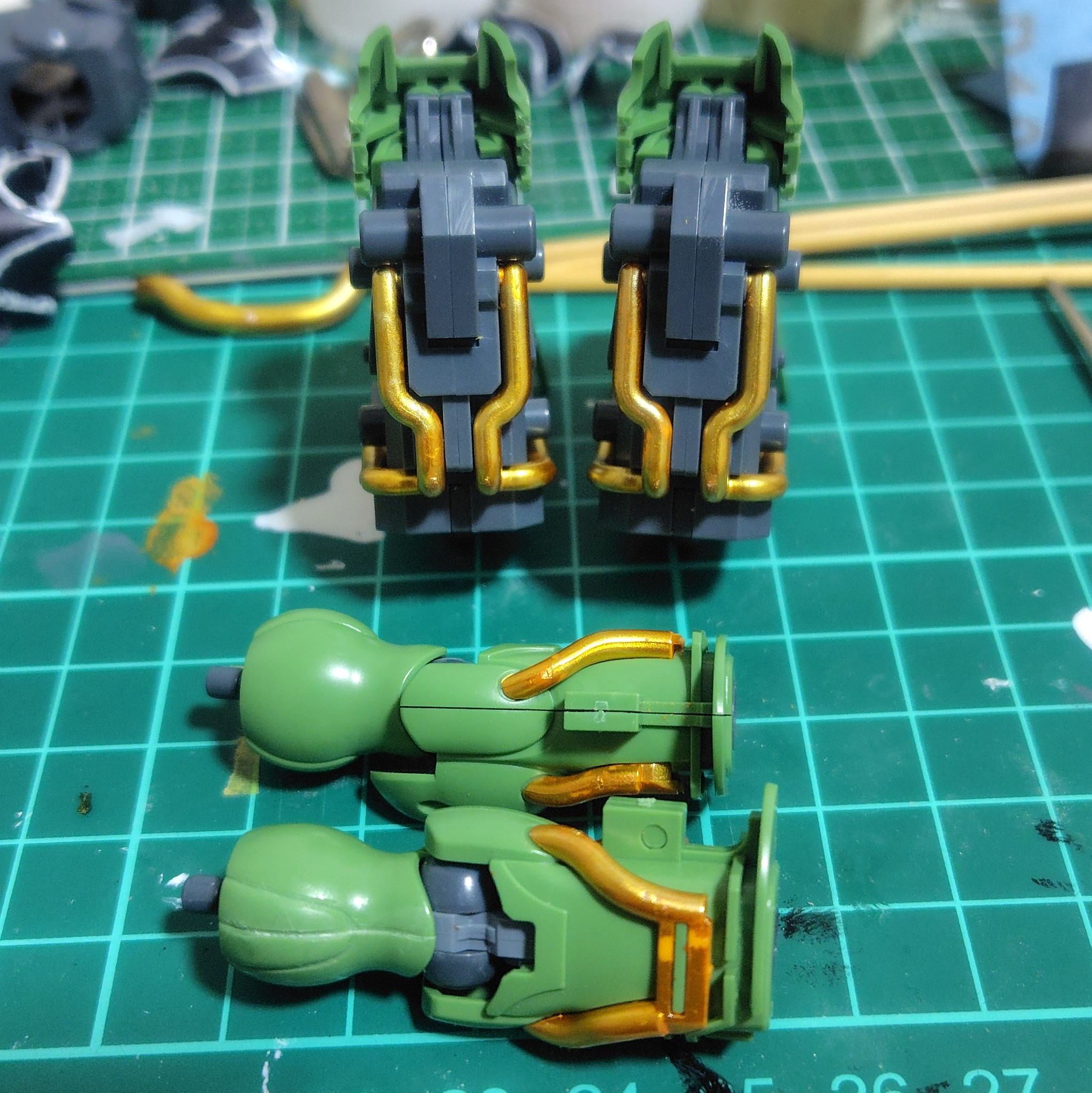 目立たない場所ならまだしも、見えるところにバリ痕があるとみっともなく見えるので、改めてイエローゴールドを吹きました。マーカーで直接塗ると赤味がかかった色になってしまったので、エアブラシシステムで改めて塗りました。写真では落ち着いて見えるけど、ピカピカですよ〜。