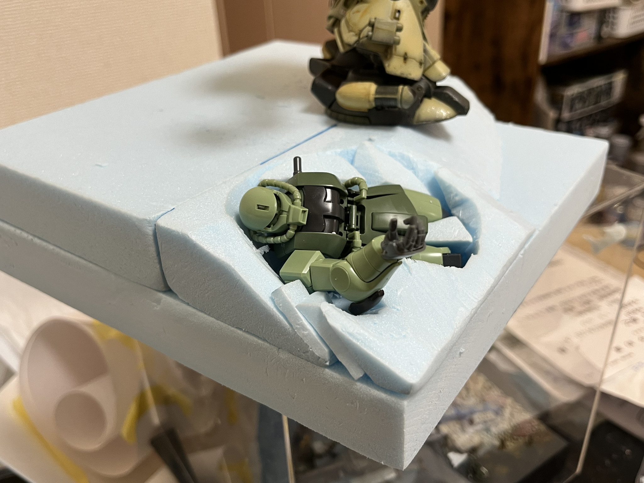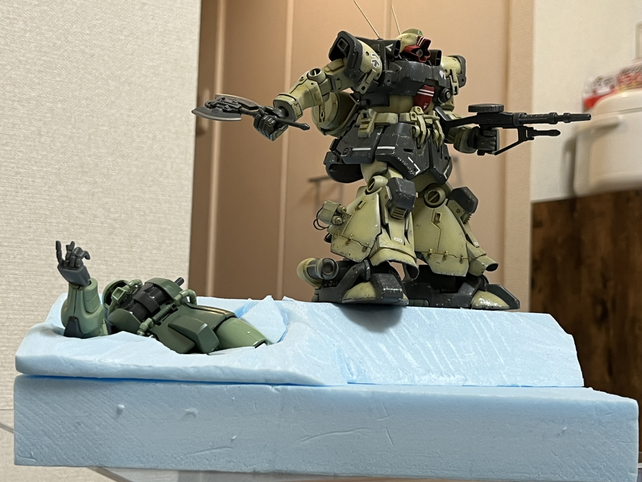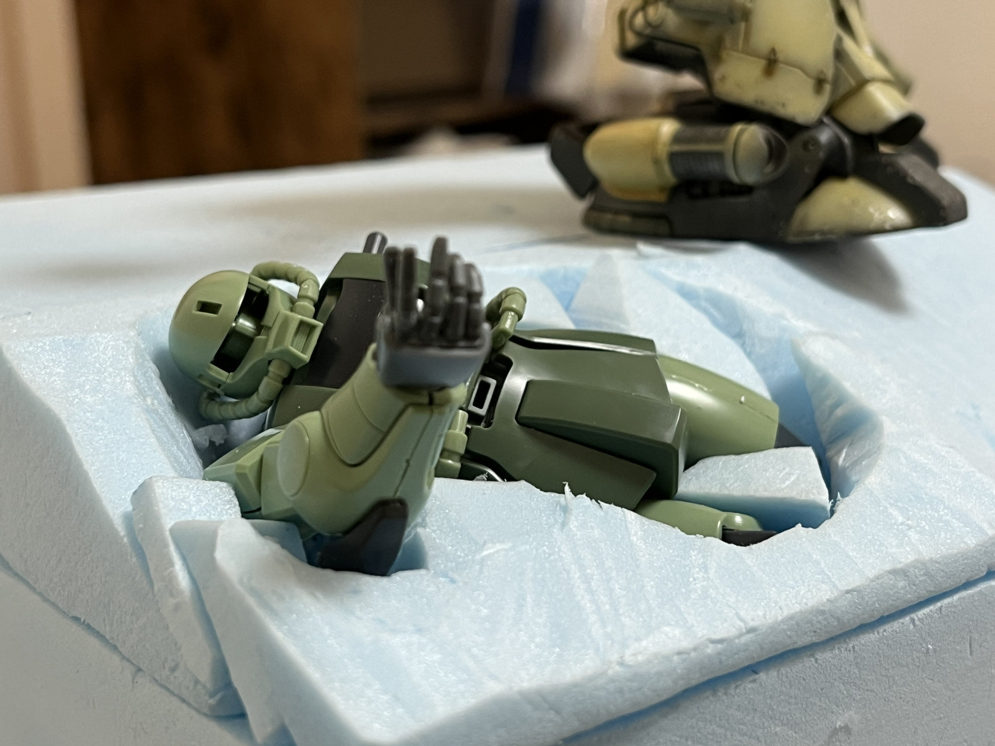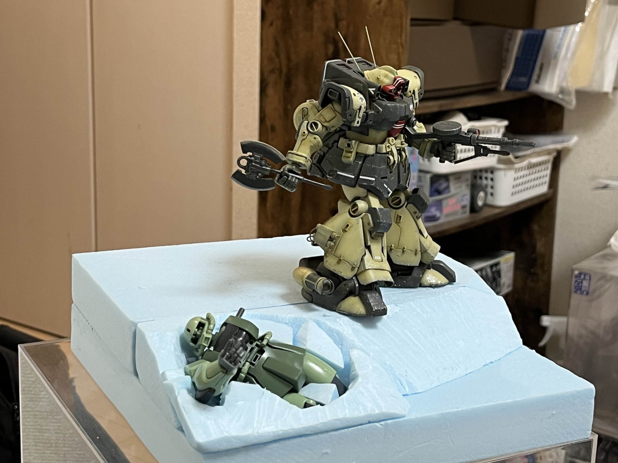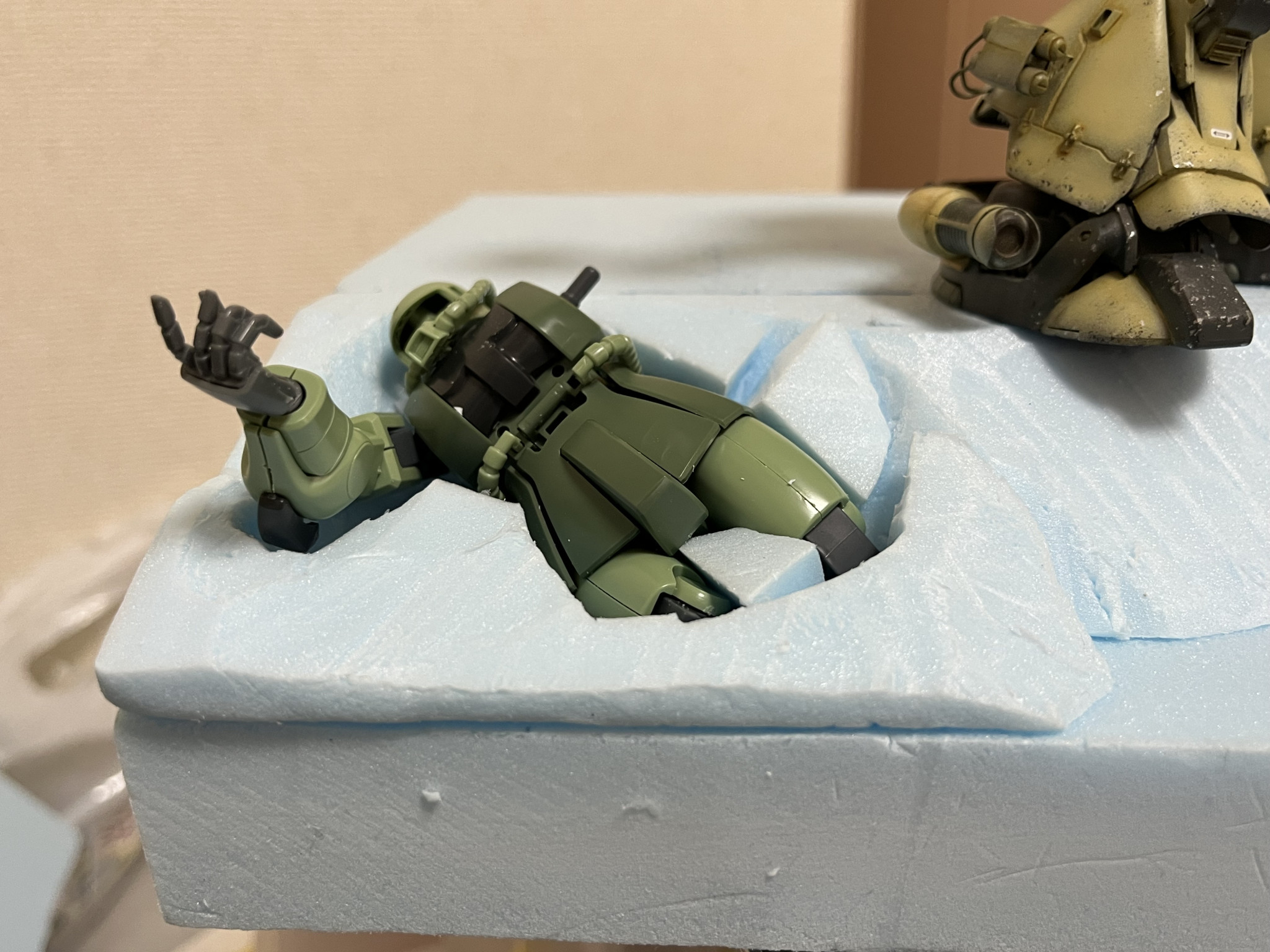 スタイロフォームを切り出してレイアウトの確認です。ただの砂漠では芸が無いと思い、朽ち果てて砂に埋もれたザクを配置する事にしました。61式とワッパ目当てで購入した「イグルー重力戦線キット」…その中で行き場を完全に失っていたザクに活躍の場がようやく出来ました😅一年戦争時に大破放棄され数年経過している設定です。「砂原や…兵(つわもの)どもが夢の後…」って感じでダグラム並みに朽ちてもらおうと思います。ドムの背後は砂煙の為にスペースを空けています。皆さんのアドバイスでドラッグストアにて自然素材の綿を入手できました。ありがとうございました😊