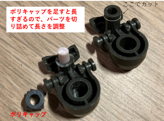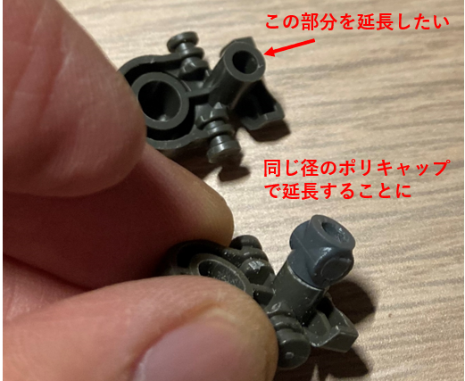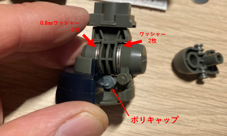足の接地部分(スリッパ)は関節部品の軸に前後2つのパーツを挿す構造になっています。その軸の接続部分の前後に0.8mmのワッシャーを2枚ずつ挟むことでスリッパを前後に3.2mm延長することができます。前後の部品はこの軸とその下にも接続部分があるのですが、ワッシャーを挟むことで関節軸の接続が浅くなることに加えて、下の接続部分が接続できなくなってスリッパが不安定になってしまいます。上の軸は回転軸なので接着剤は使えませんが、下の軸は回転軸ではないので何らかの形で接続して接着してしまえばよいのですが、塗装のことを考えると取り外しができた方がよいので、余っているポリキャップを使って接続することにしました。ワッシャーはホームセンターで売っているもので18枚で150円ぐらいでした。