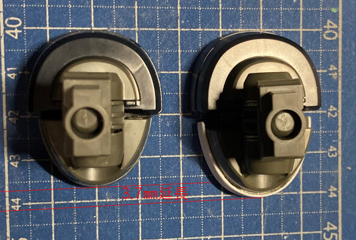 まだスリッパが小さいような気がしたので、前部のパーツを0.5mmプラバンで一回り大きくしました。3.2mm+0.5mmであわせて3.7mmスリッパが前後に長くなりました。