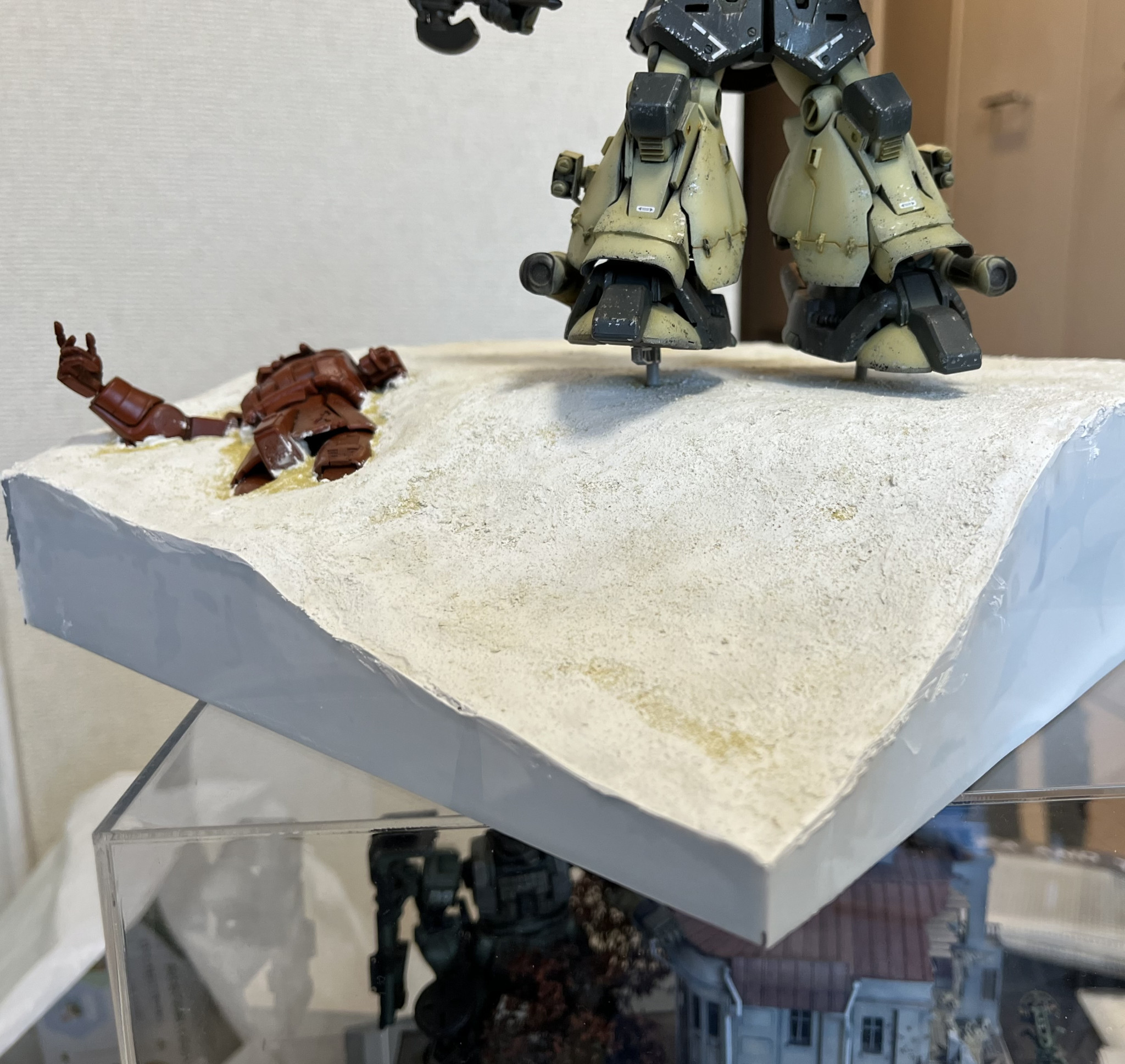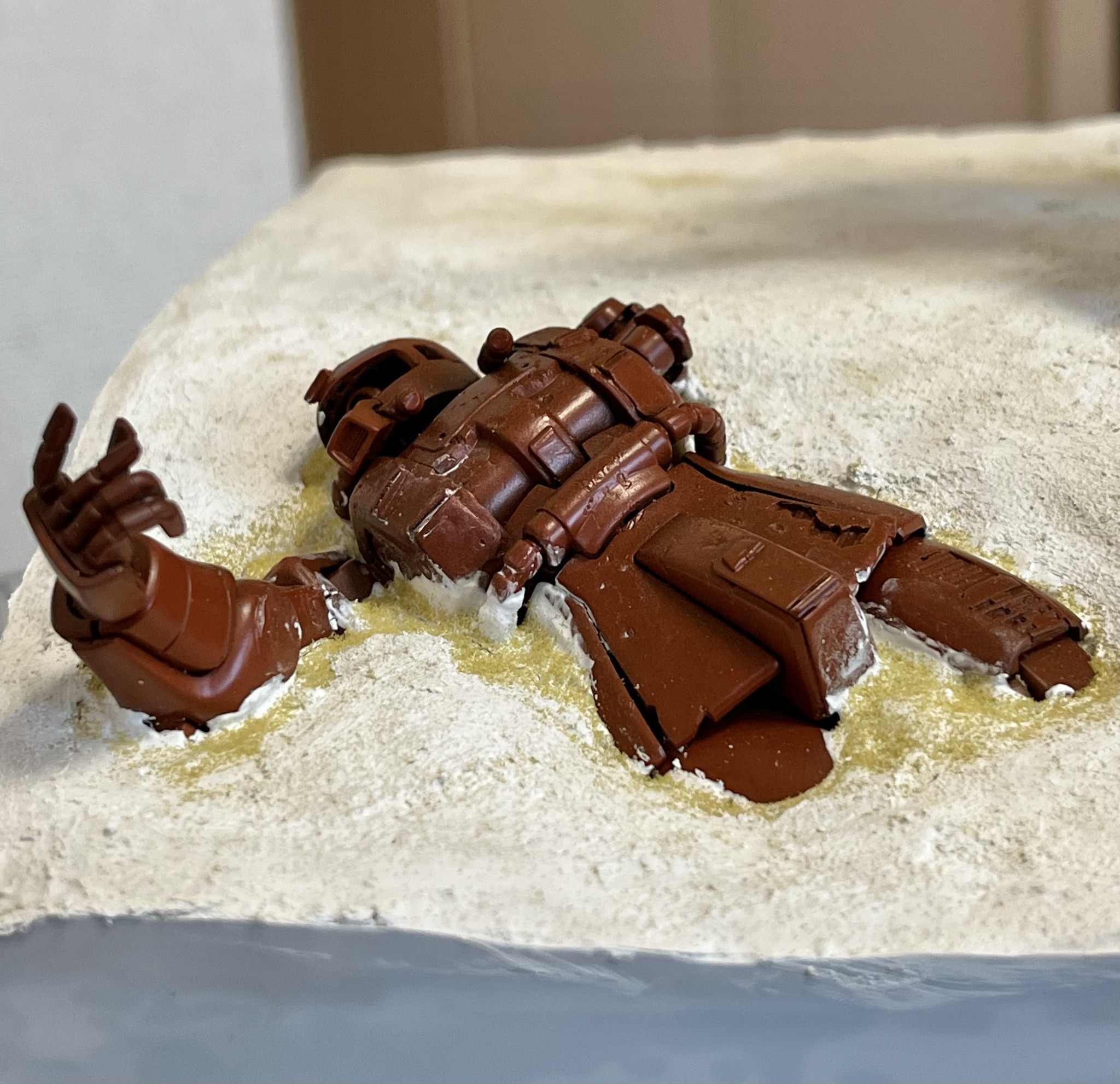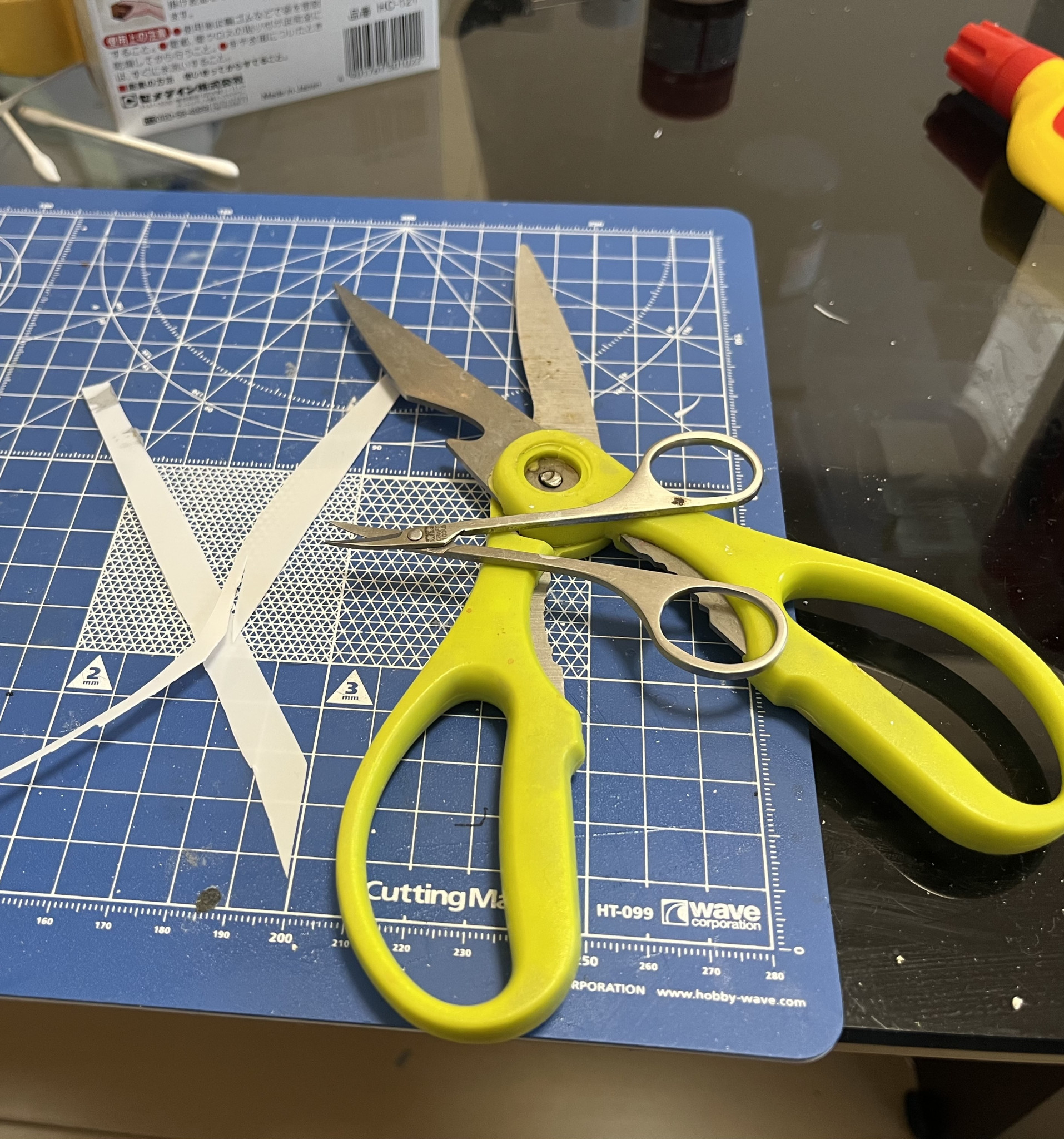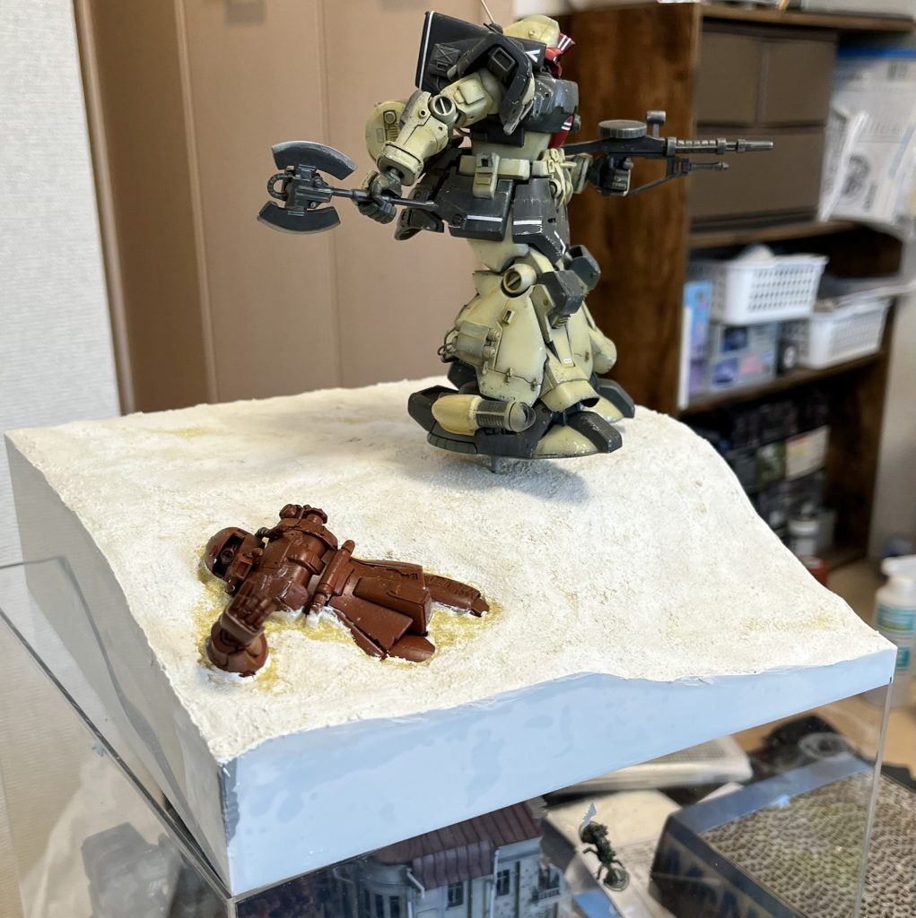 ジオラマベースの作成です。側面の露出したスタイロフォームに0.3ミリのプラ板で化粧回を施します。スタイロフォームに木工ボンドを塗ったらその上に幅だけ合わせた高さは大雑把な長方形にカットしたプラ板を貼り付けます(2枚目)。乾燥後にハサミでベースの地面ラインに合わせて切り取ります(3〜5枚目)。使用したハサミはキッチンハサミと爪切りハサミ(7枚目)。その後、プラ板とスタイロの隙間に再度パウダーを混入した石膏を塗り込み、乾燥によりヒビが入った地面表面にも同じくパウダーを混入した石膏を指先で塗り込みます。私のジオラマ作りのいつもの作り方になります。