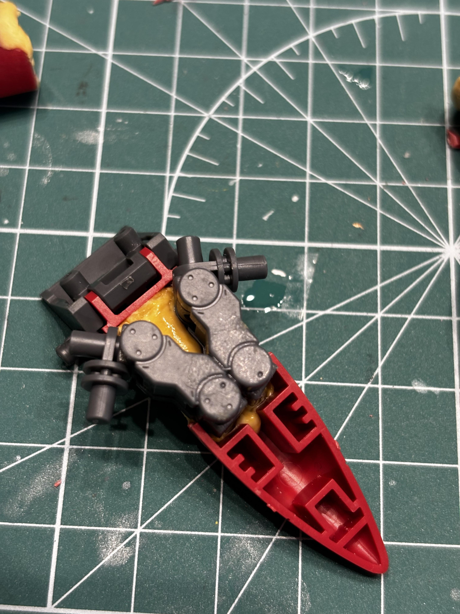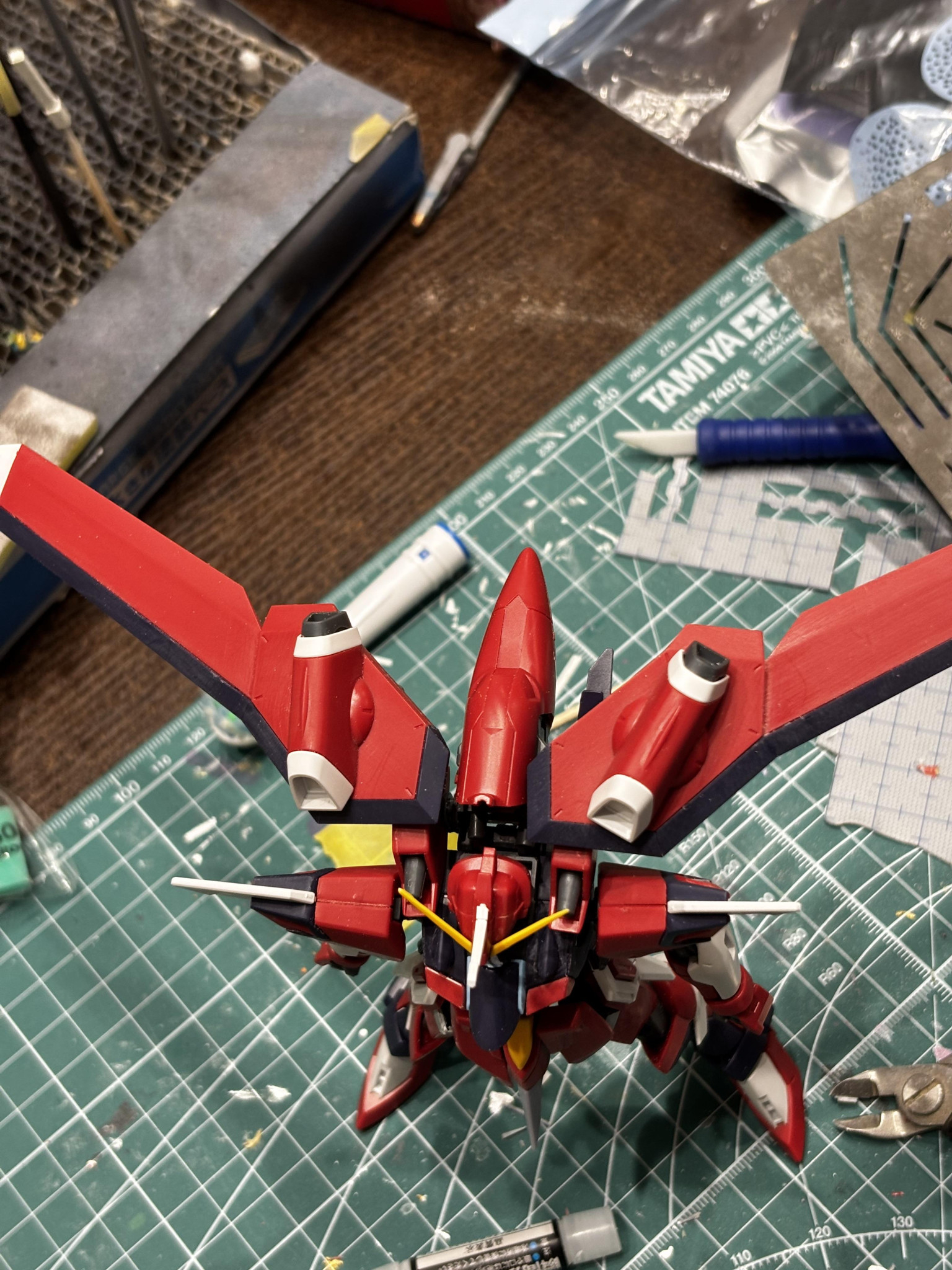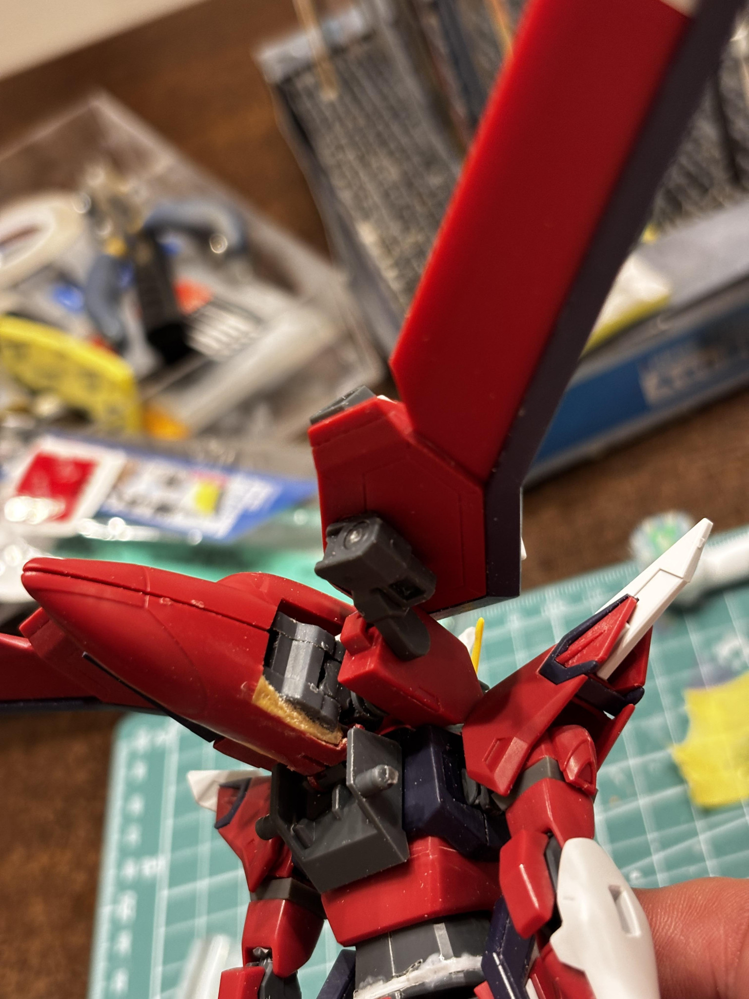 そのままでは肩に担ぐように稼働しないので、機首の中にブキヤのパーツを仕込んで、機首の可動を生かすことにしました。無駄にマントのように広がった翼は駐機状態にもなります。