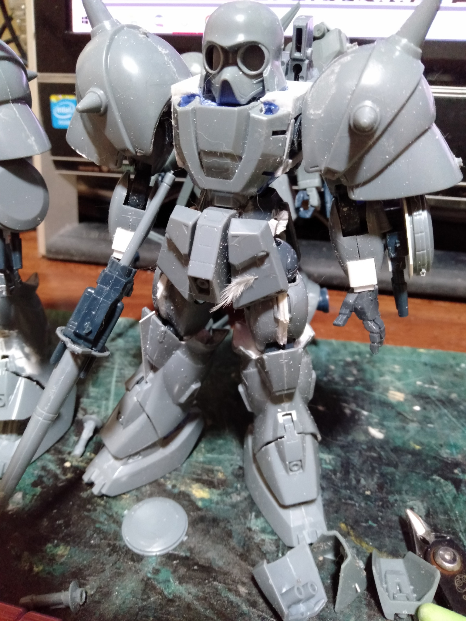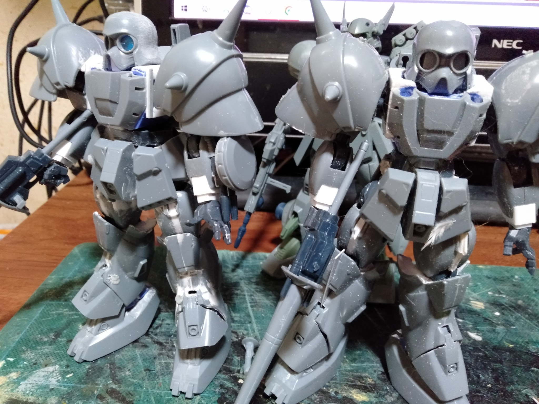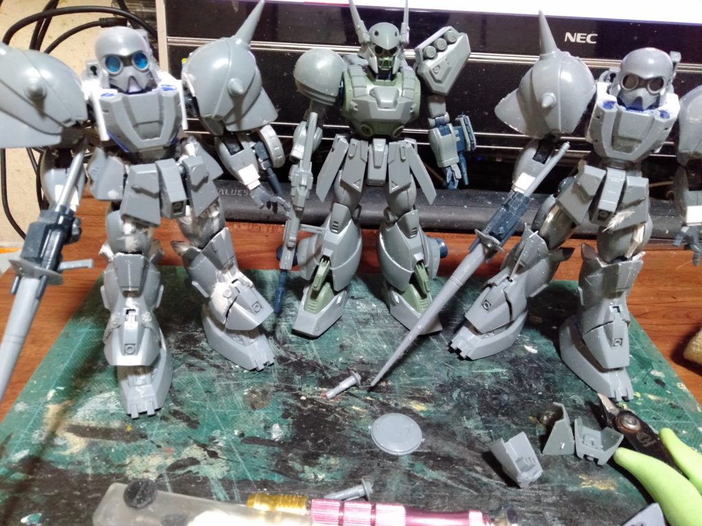 流れで、のちに”黒の部隊仕様”にする”デナン・ゾン”も改造しました。というのは上腕部の製作時に「やっぱ、キットの使えるんじゃね?」という感じで製作してからの流れでもう1体を。 まぁ先にプロトタイプ的な製作をしていたんで、「やっぱこっちの素材の方が」という様な改編で、サクサクとできましたね? あとは、先に製作中の足首カバーをカットしすぎたので、プラバンでやり直すか、または補足していくか”デナン・ゲー”の足首カバーをお取り寄せるかで悩んでます(笑)。