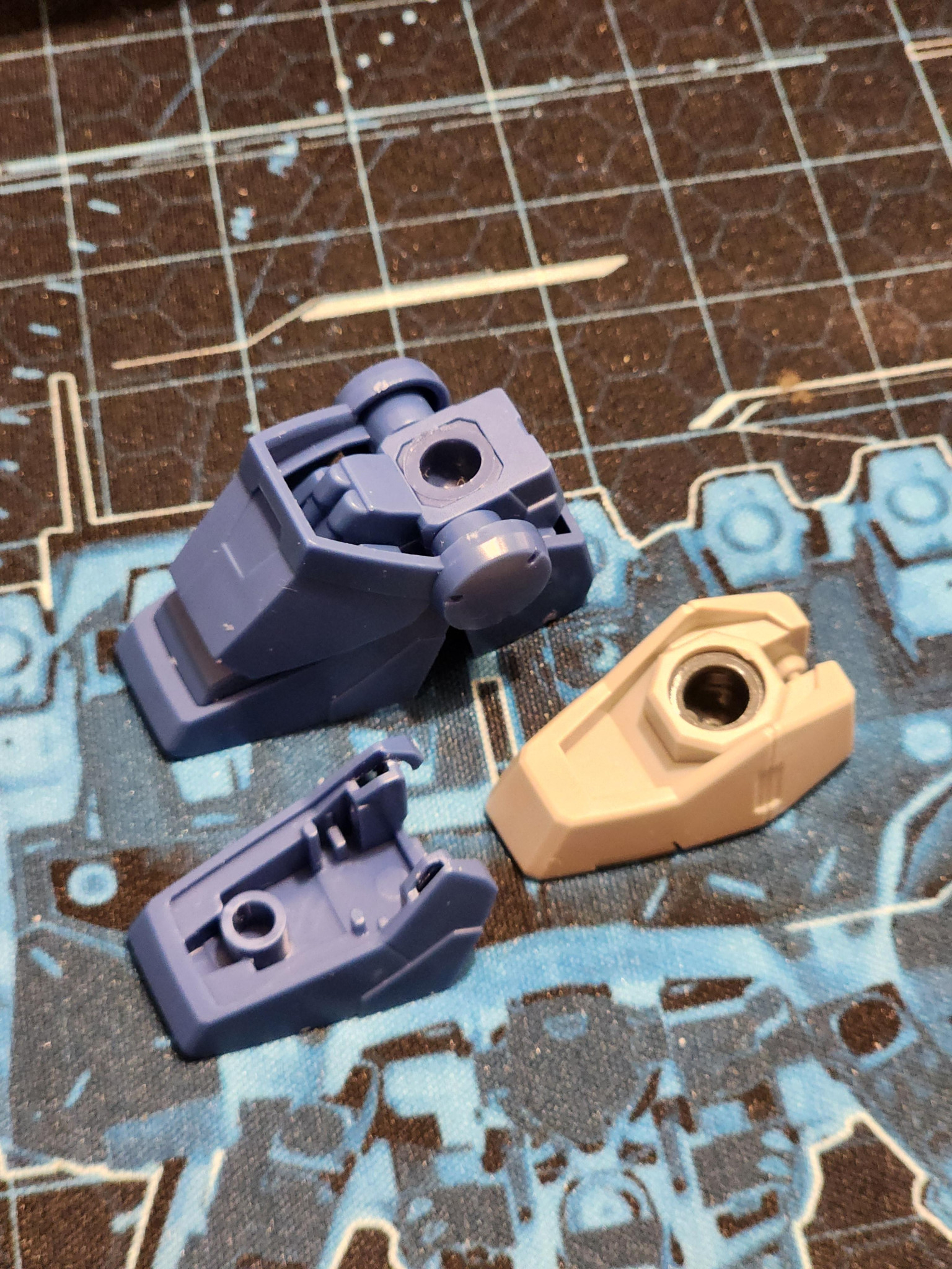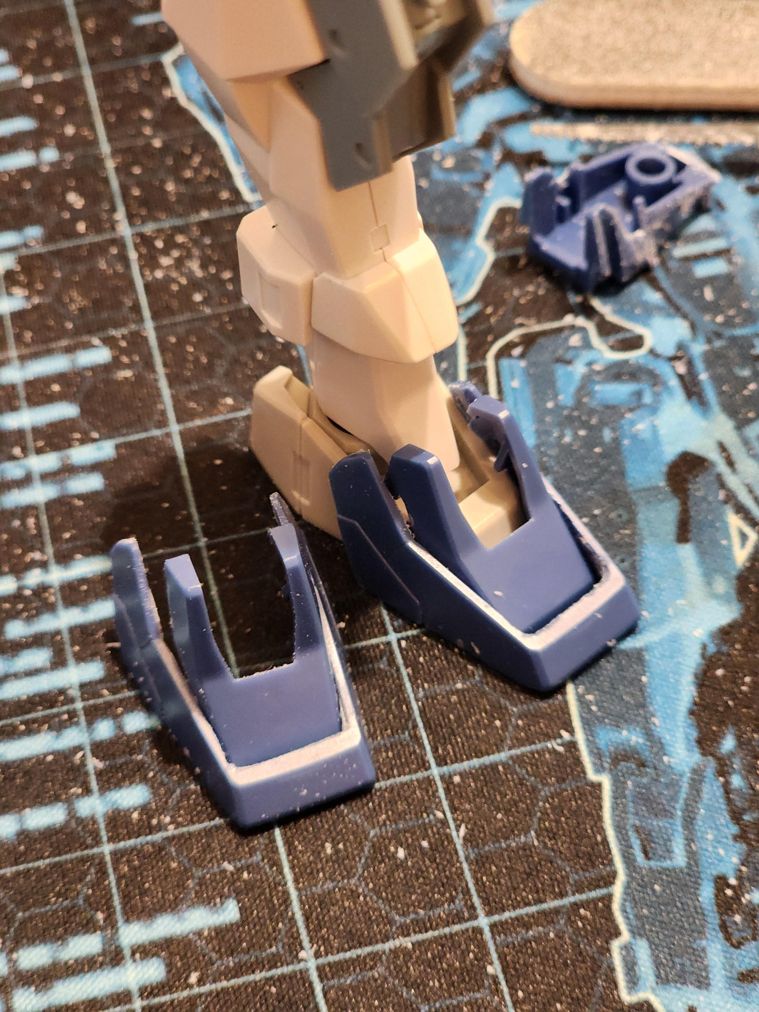 ブルーデスティニーのジャンク品から足をいくつか取り出し、外側の縁を削ってケルディムの足の前部に取り付けた。かなりフィット感が良い。