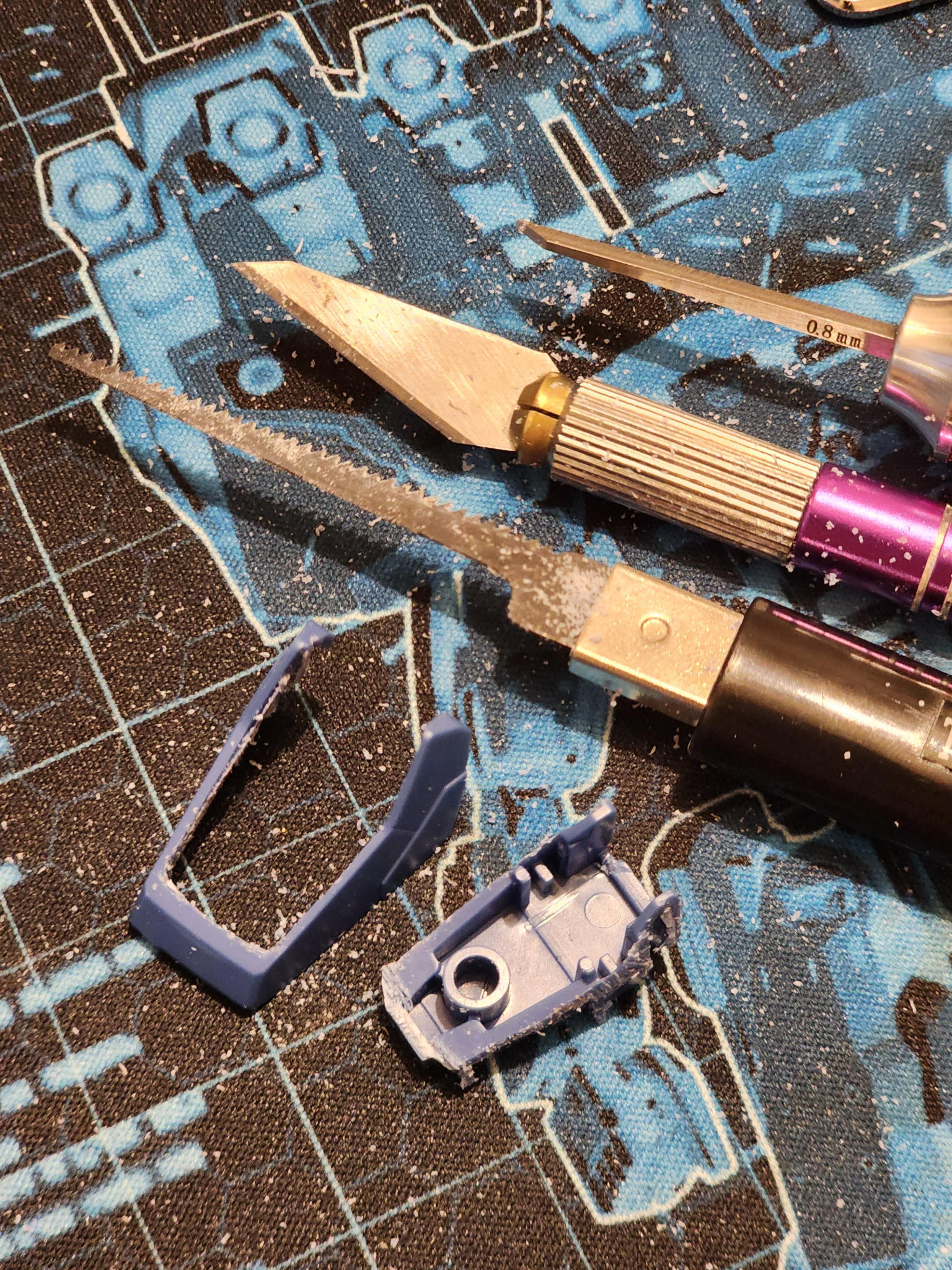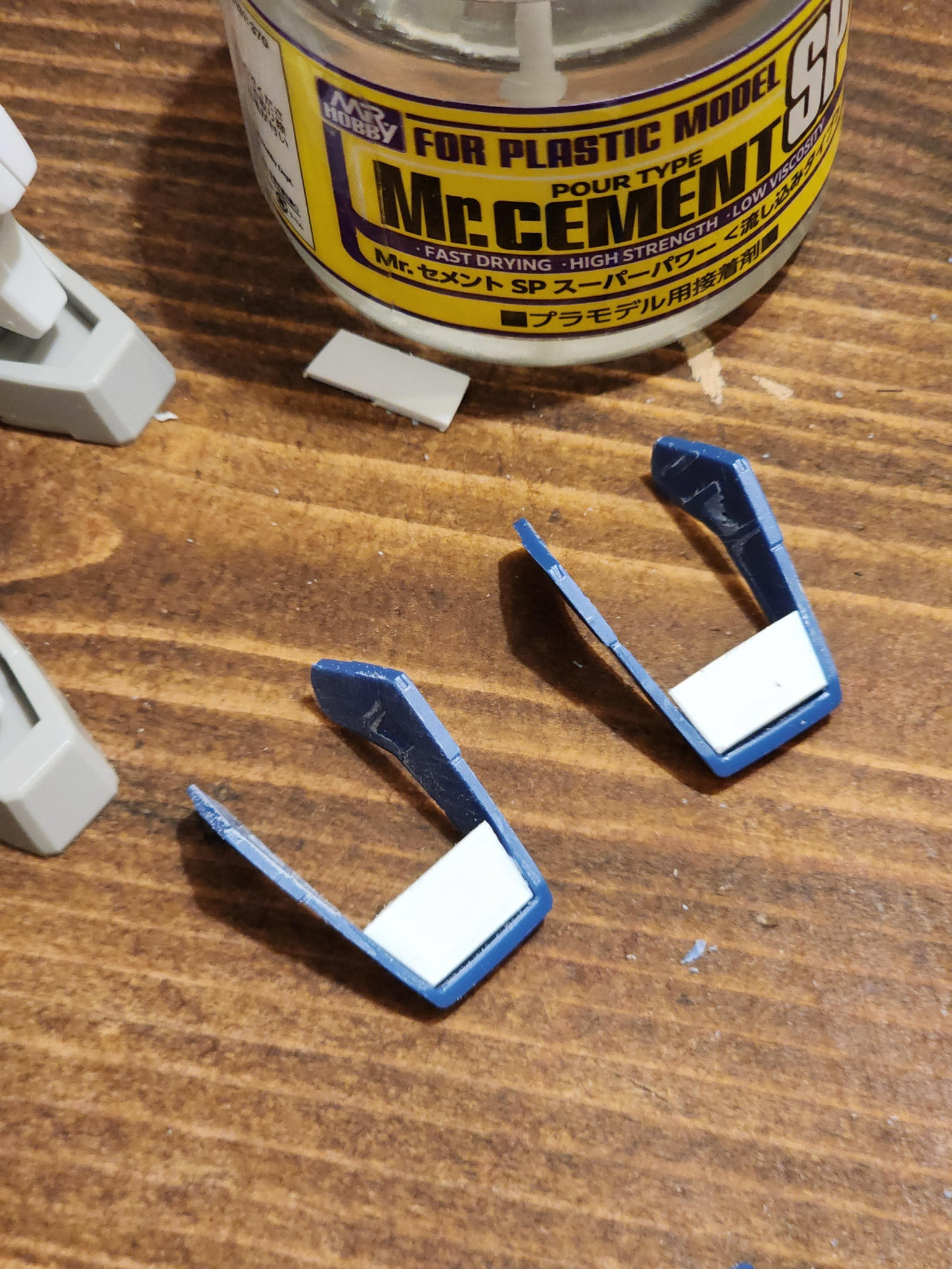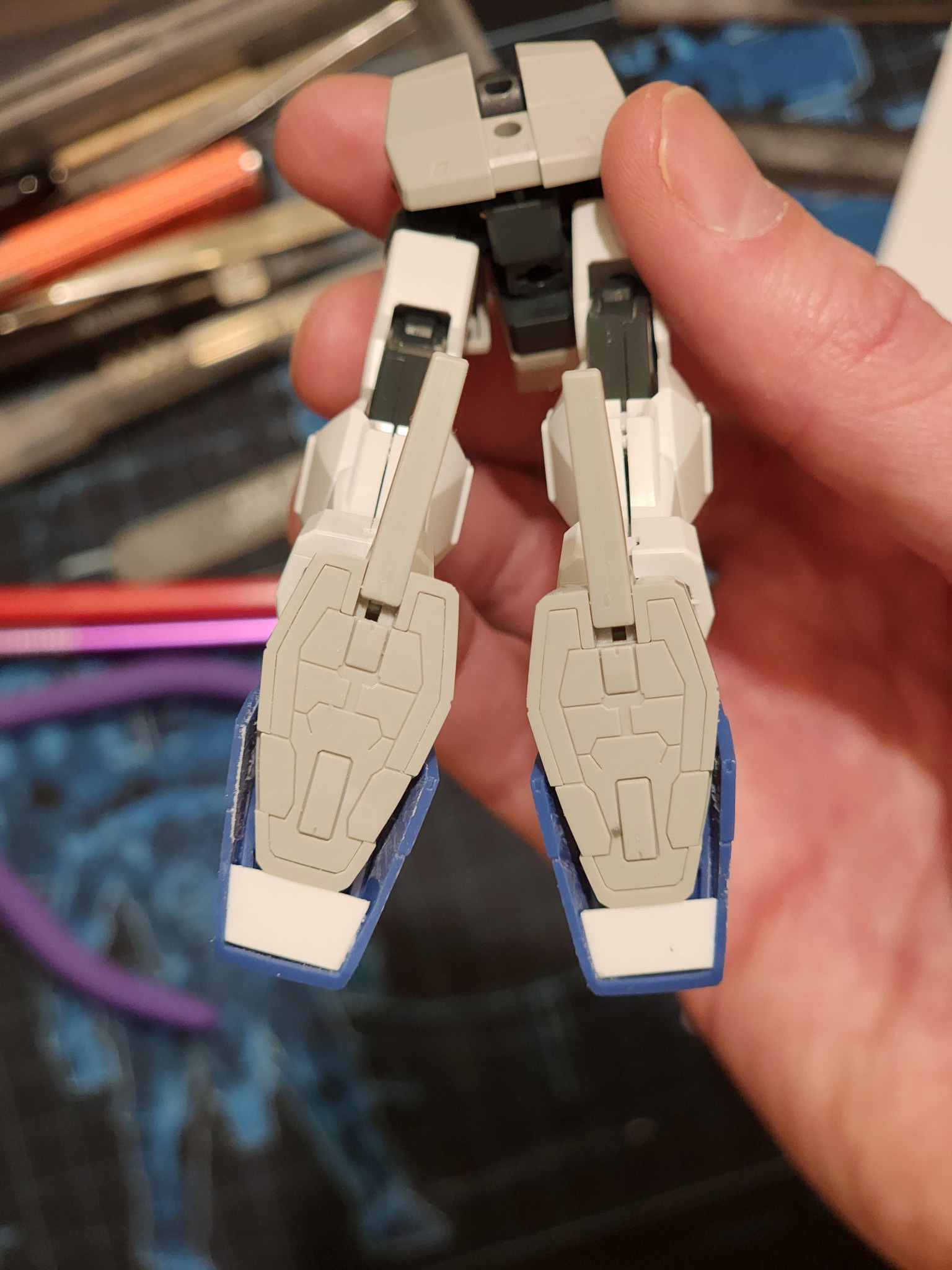 Using some feet from a junk Blue Destiny, I carve away the outer edge and add them to the front of the Cherudim feet. It’s a pretty good fit.