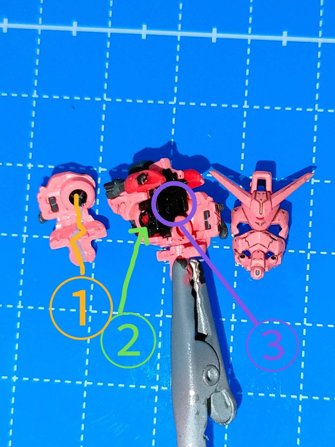 ③は黒く塗ってるので分かりにくいですが頭部中心付近にLEDチップが入るほどの隙間を作る。