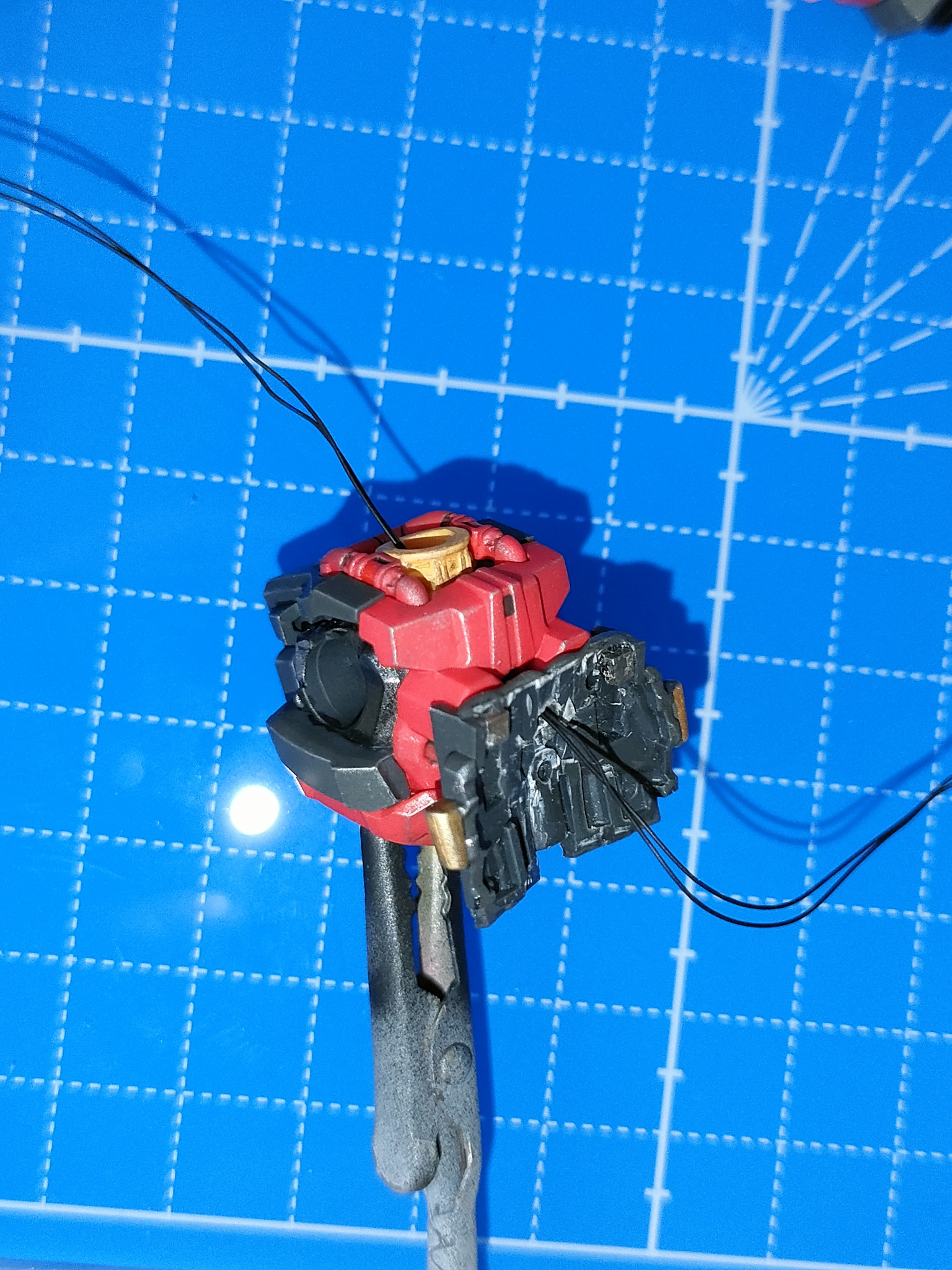 胴体部に接続し、接続ピン中心にピンバイスで胴体部ごと貫通させます。開けた穴に背中から首に向けてLEDを通します。