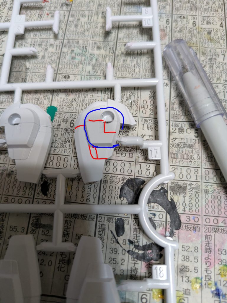では、ランナーから切り離しする前には何もしないかというと作業はします。モールドの掘り直しです。使う道具は100均のです。画像の赤い部分はキットに元からあるモールドです。青い方は特にモールドはないですが、掘っておくと墨入れが映えます。赤い方だけでも効果があります。