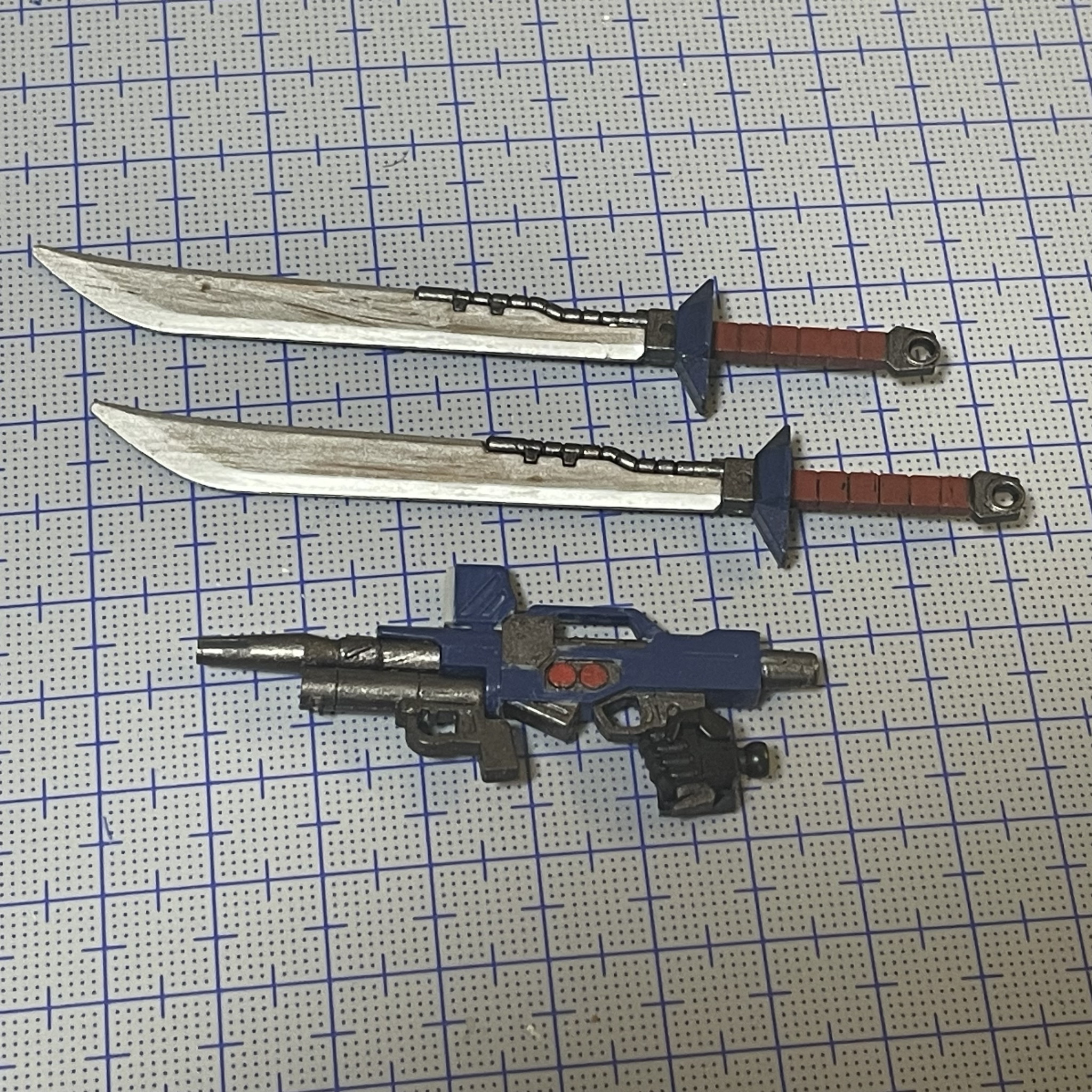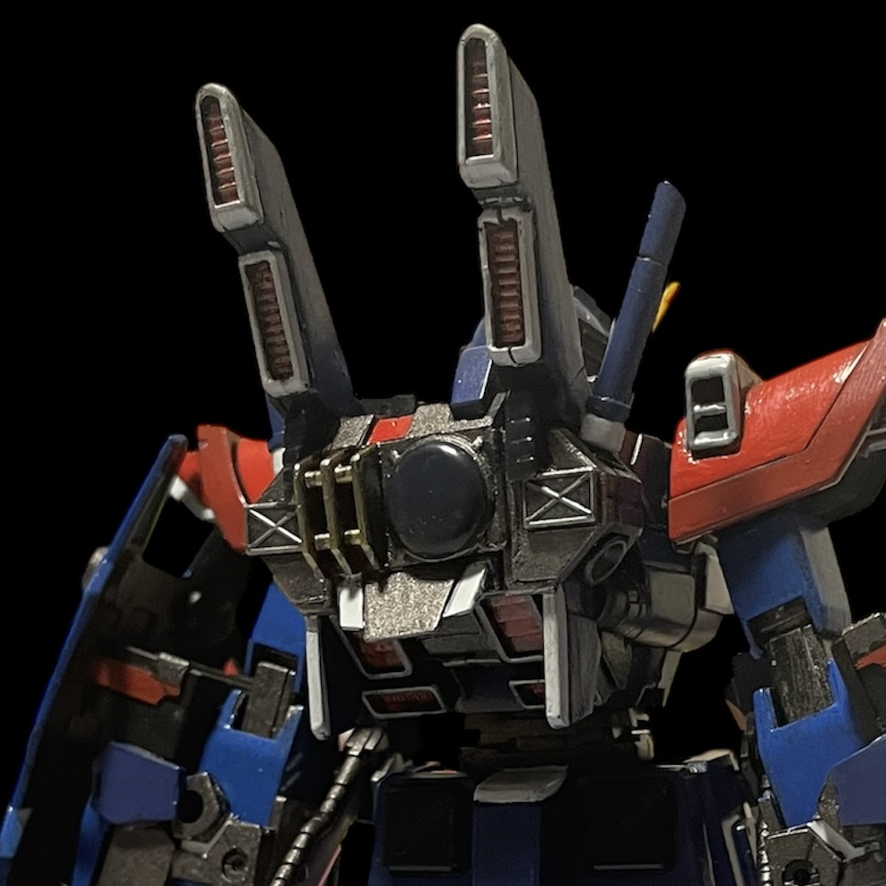 顔を白にしてみましたが、違和感があるので設定通りの青の方が良いと思うので直しですね。また、赤と白の差し色がうるさい感じもあり関節は焼鉄色とゴールドにしましたがまだうるさいですね。デカールはって落ち着けばいいのですが🤔