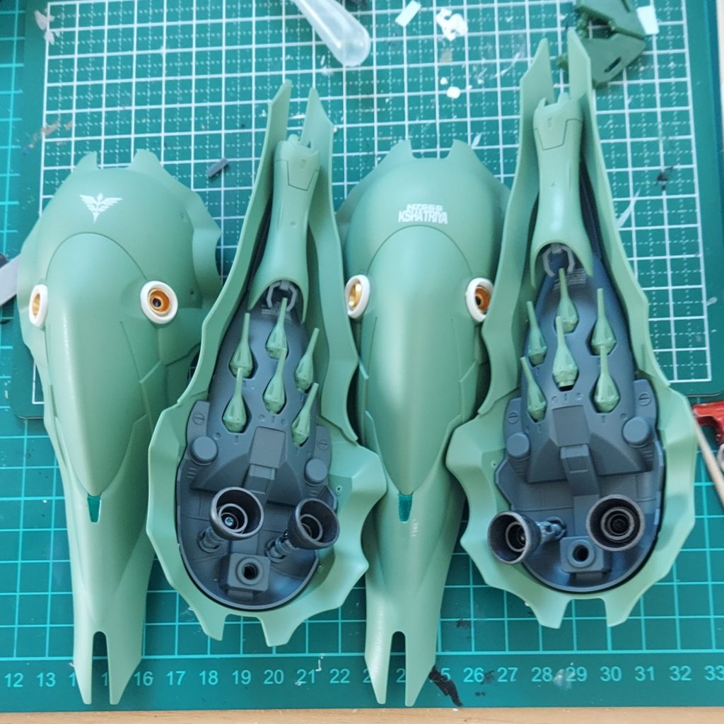 先にも書いたとおり、バーニアは焼鉄色で塗装。ほかに、つや消しのトップコートの後に、ワンポイントとしてメタリックグリーンを入れてみました。サイコミュの増幅装置的なものと思っていただければ。双方とも水性ホビーカラーです。メガ粒子砲の砲口の、金はガンダムマーカーEXのイエローゴールド、黒は水性ホビーカラーのブラックです。