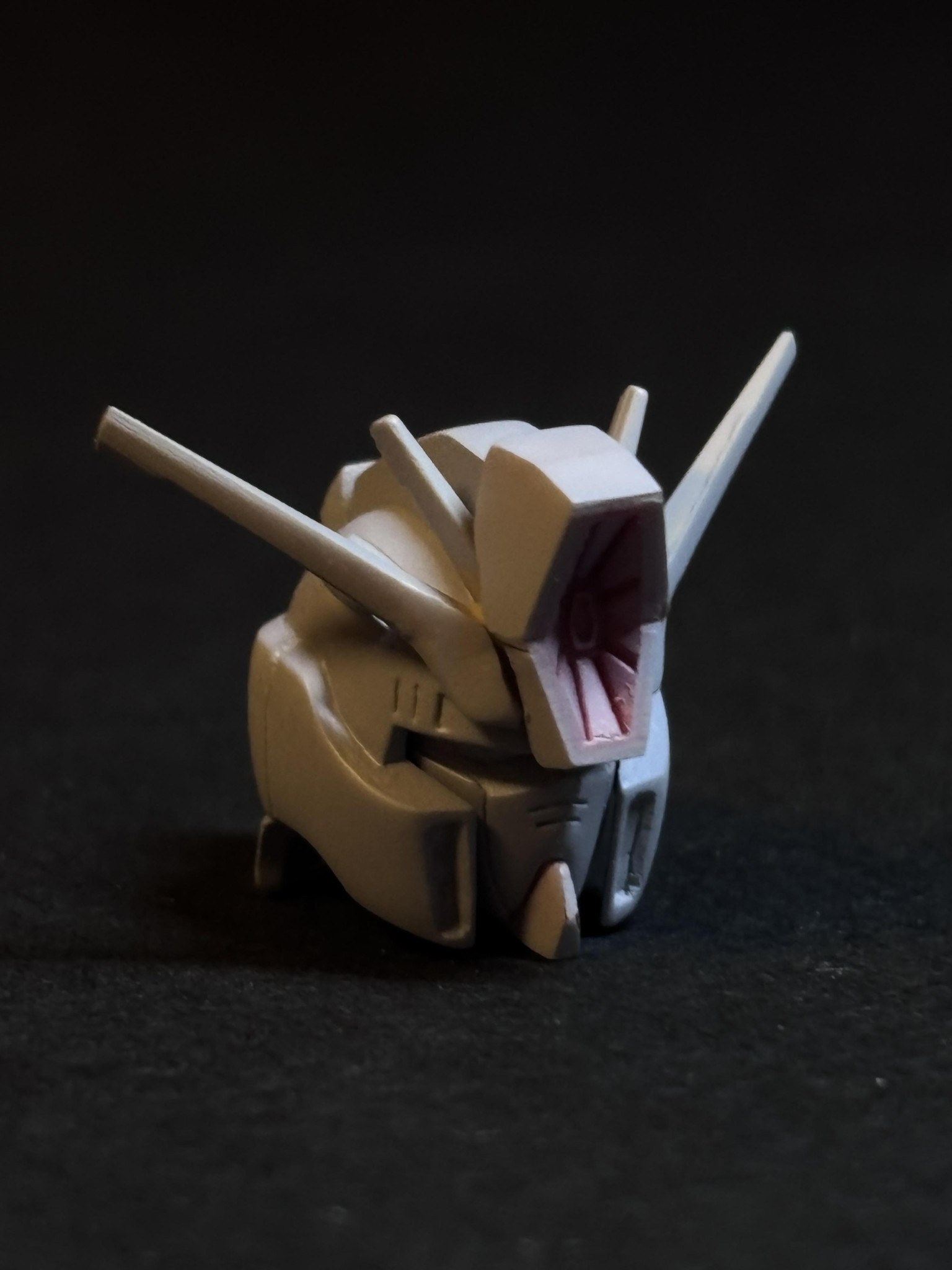 MGフルアーマーKaに寄せていこう。改造第1週です。(〜26.3.1)。モチベが高いうちにまずはお顔から。① 目付きが鋭くなるようにお顔を少しヘルメット側に押し込みました。鼻筋は除去。への字スリットは下側だけ掘り直し。顎も細くしました。②ヘルメットは両側面のダクトは別部品にする予定。頬を削り落として整えてます。頬のダクトも埋めてから掘り直し。③後頭部に丸みをつけて、トサカを延長。筋彫り追加しました。④ハイメガ拡張(やり過ぎました💦)、アンテナはキャノン脇のとこを肉盛りました。【感想】サフチェックって偉大ですね笑。色んなアラがいっぱい出て来ました。ガサガサ、歪み、不均一🤣‥修正してやるっ!MGフルアーマーのキットレビューがいっぱい上がって来るので資料には事欠きません。ありがたやー🥰