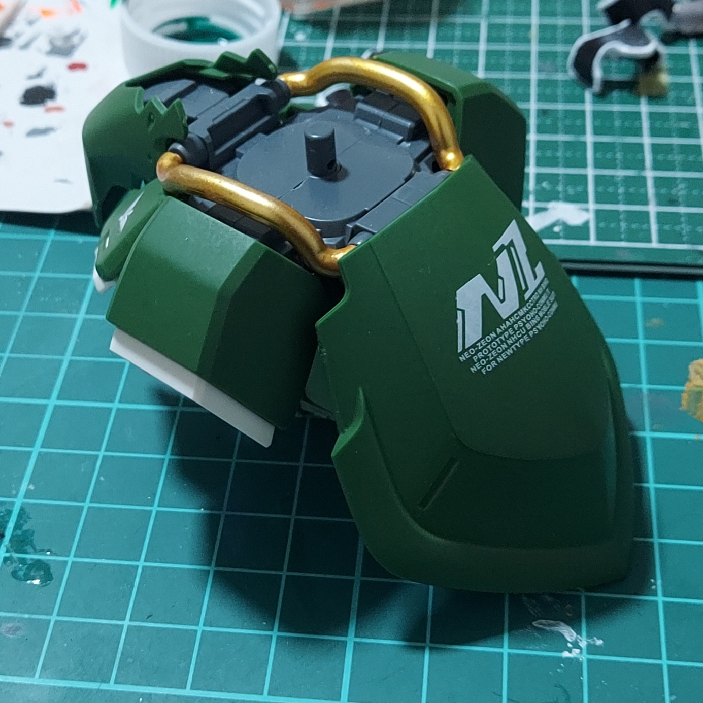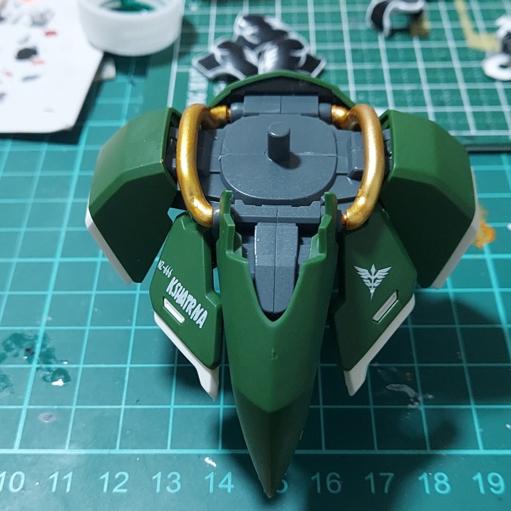 またイエローゴールドが剝がれやすく、ガンダムマーカーのクリアー光沢で保護したはずなのにパーツをはめようとするとすぐ剥がれてしまうので、3回くらい塗りなおしました。最後は水性トップコートで保護。