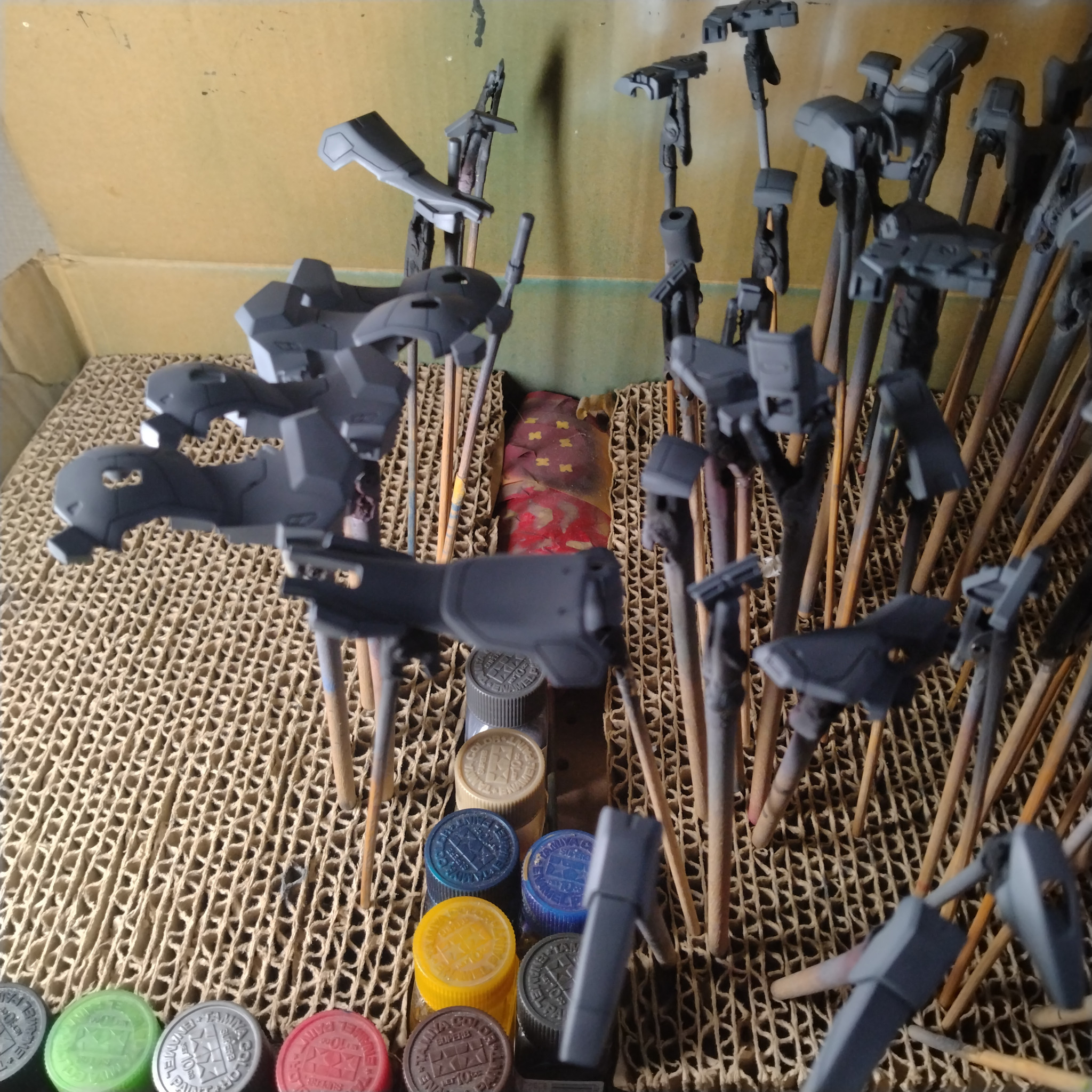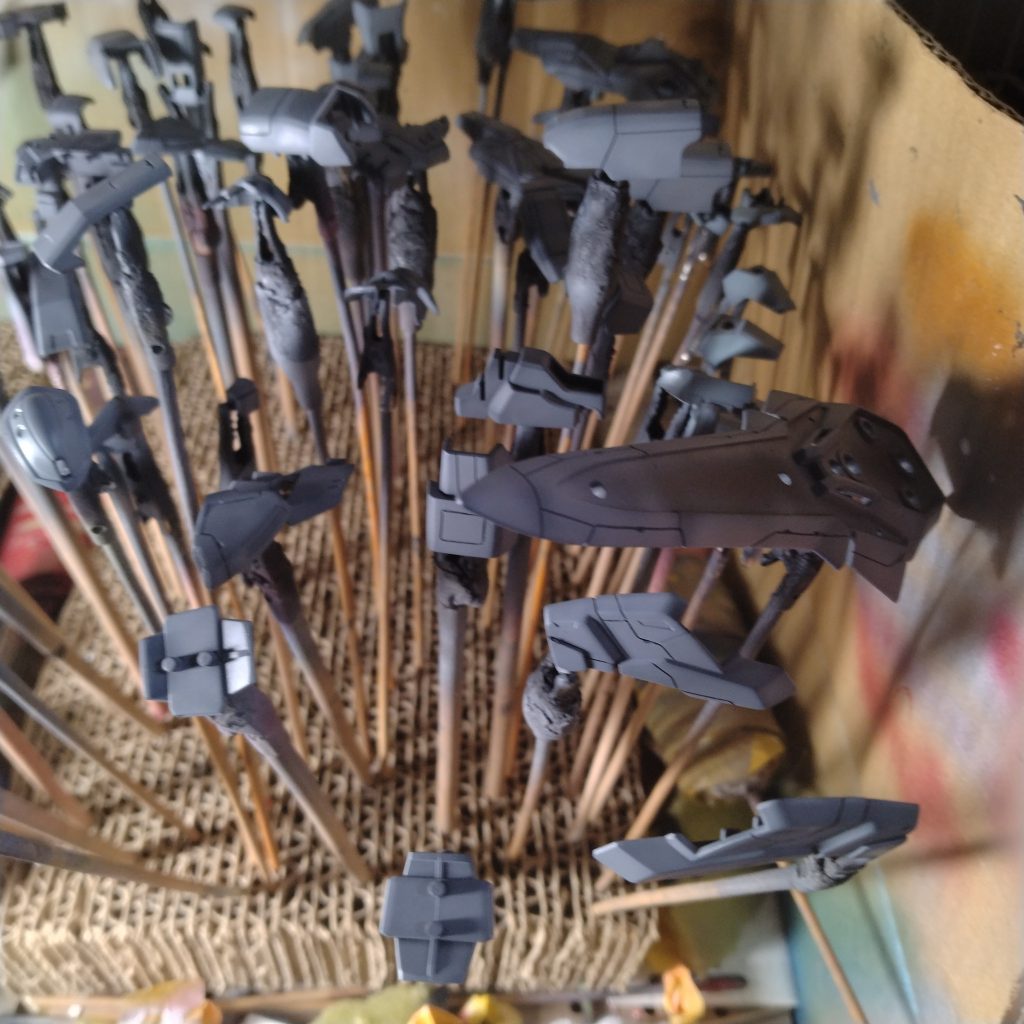 取り敢えず!基本外装のグラデーションが終わりました!見えづらいですが2種類のグレーの塗装が終わりました!😀やっぱ若干、本調子が出なくて!😅それとですが!これは私的に伝えたい事なのですが!以前ハンドピースのスーパーファイン0.2のニードルを安価で購入したハンドピースのニードルと付け替えて上手くいったと思って数回使用したのですが!ヤッパリ駄目でした!😅微妙に吹かした時に細かく散るんです!なので安価なハンドピースにニードルを戻して使っていたのですが!ここで良いハンドピースとの差が出てきました!私はほぼ塗装は長時間するのですが!この安価なハンドピースは使えるのですが長時間使用すると凄く疲れて指や手がつってきてめっちゃ疲れます!😅お伝えしたい事はやはり良いハンドピースや昔から使われ今も健在のメーカーのハンドピースは良いと言うことです!😄高いんだよって思うけど!それだけの価値はある良いものはやはり良い!ってことですね!😄飽くまでも私個人の感想ですが!なのでめっちゃ疲れたので!ここで一旦ストップします!😄やはりタミヤショップにニードルを注文しに行かないと行けませんね!私にはスーパーファインがあってるみたいですので!😀次回は紺色系や武器類の塗装をやります!😀