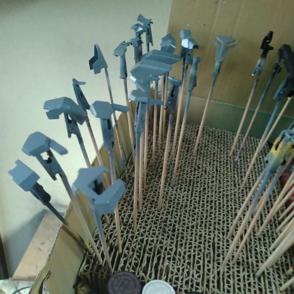 取り敢えずは塗装再開して紺色系、武器類等のサフ吹かしました!😀それと今回は余り塗り分けはしないようにと思ってたのですが!ヤッパリせっかくスジ彫り入れて仕切りがあるのに勿体ないかな?と思って少しだけ塗り分けしました!アックスは元々使わないのですが!ジャンクに3何故か枚だけエフェクトパーツがあったのでサーベルと一緒に一応塗りました!で、ウッカリ忘れていたのですが!このキットの塗り分けが超面倒くさい所があったんです!😅それは両足のブースター?言い方間違えてるかもですが!赤い箇所のマスキングが面倒くさいんです!これはエングレービングより面倒くさい塗装だと思います!😄次は休憩してから、これらに色を入れていきます!😀