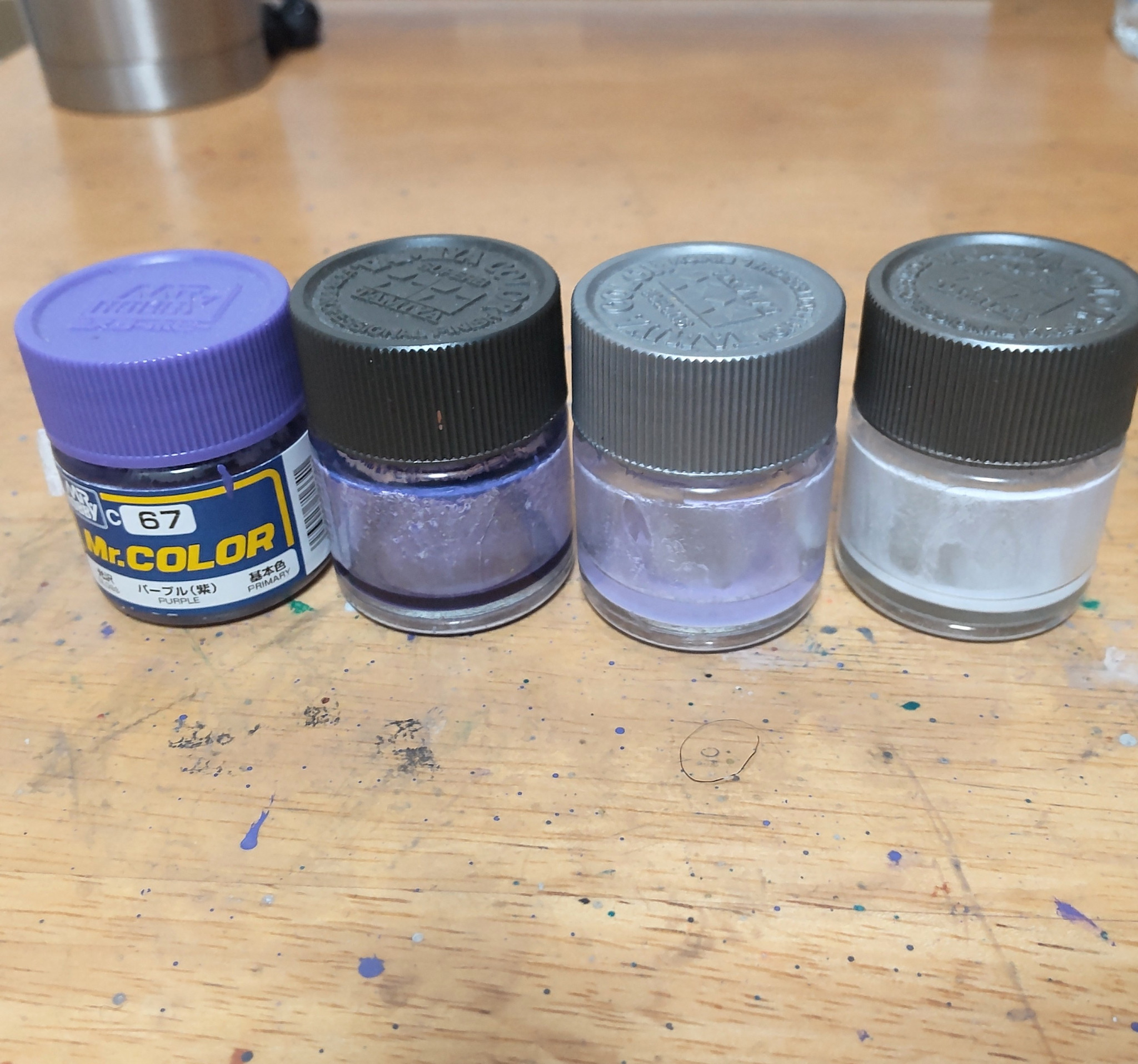 ホワイトとパープルの塗料を違うもの(アクリルとラッカー、ラッカーとエナメルとか)にして、綿棒でぼかすとかできないのでしょうか?思い付きでコメントしてみました😸