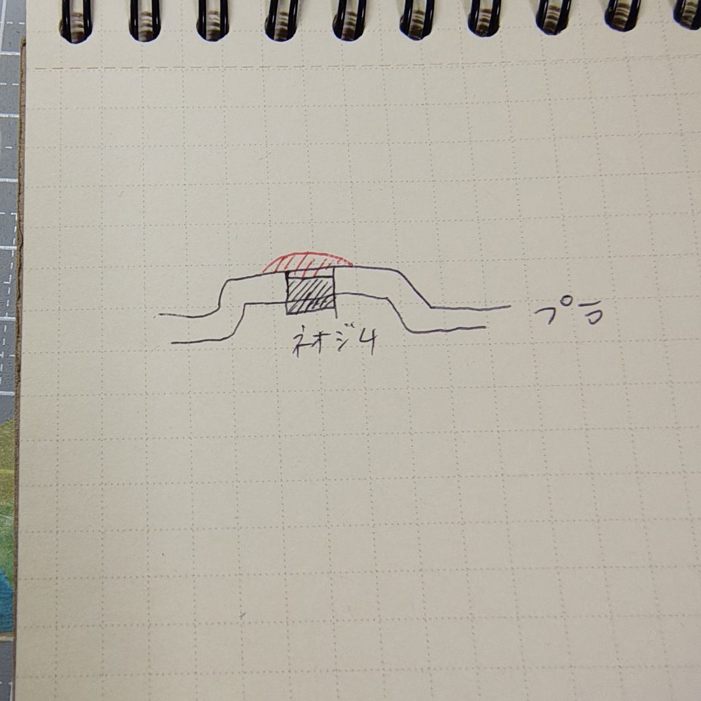 ここでは脛側、アーマー側です。次にギリギリ表面より深くなるように磁石を入れて(写真1)、瞬着(orパテ)を持って(写真中の赤い部分)固まったらツライチになるように削ります。裏からも瞬着かパテで磁石回りを補強しておくとベターです。