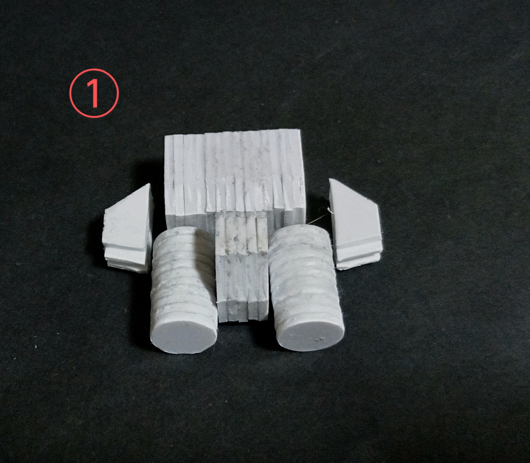 ①の画像で今回も積層プラ板削り出しで製作しました。