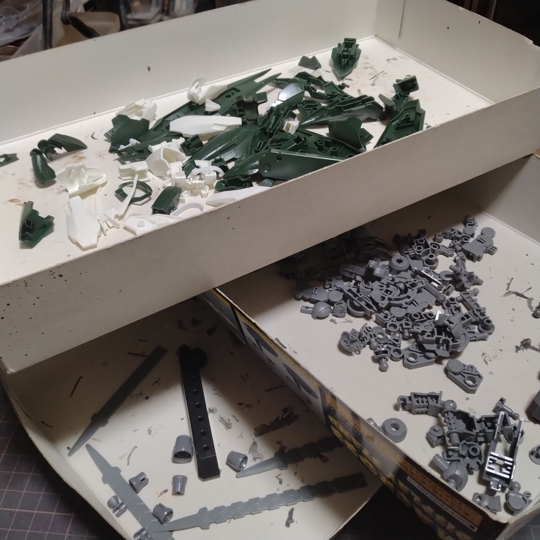まぁ本格的にまだ動かずともパーツカットくらいはしておこうと!例のごとくアニメ見ながらカットしました!😄今回は普段は色事に分けて仕分けしながらカットするのですが!今回は外装はほとんど同じ箱に入れてます!一旦はほぼホワイト系で塗装して後からイメージして見て色を足して行く方法で行こうと考えてます!実は外装をほとんどホワイトにするのは決定事項なのですが!ポイント事にライン的な差し色をグレー系にするか?もしくはちょっと目立っ赤系か紫とか色々と思案中です!😄鉄華団エンブレム貼るなら結局はエンブレムが赤なので!結局何処かしら赤ははいることにかかるのですが!😄今回制作でもっとも頑張らないといけないのは!スジ彫りです!ホワイトにするなら、それを活かすも殺すもスジ彫りとグラデーション塗装が決め手になる気がしてます!グラデーション塗装の強弱は使い分けますが!😀まぁこれもいつもの事ですが一応言っておきます!ゆっくり考えながら作ります!😄